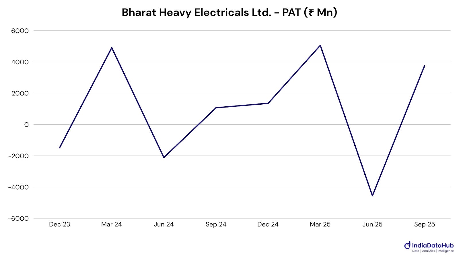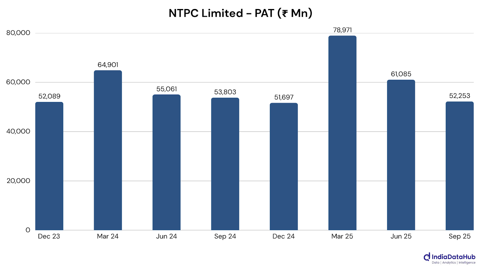 NTPC Limited: Profits eased slightly as higher taxes and interest costs offset efficiency gains. Seasonal demand softness kept revenue flat, though NTPC’s steady margins highlight continued operational discipline amid shifting power demand.