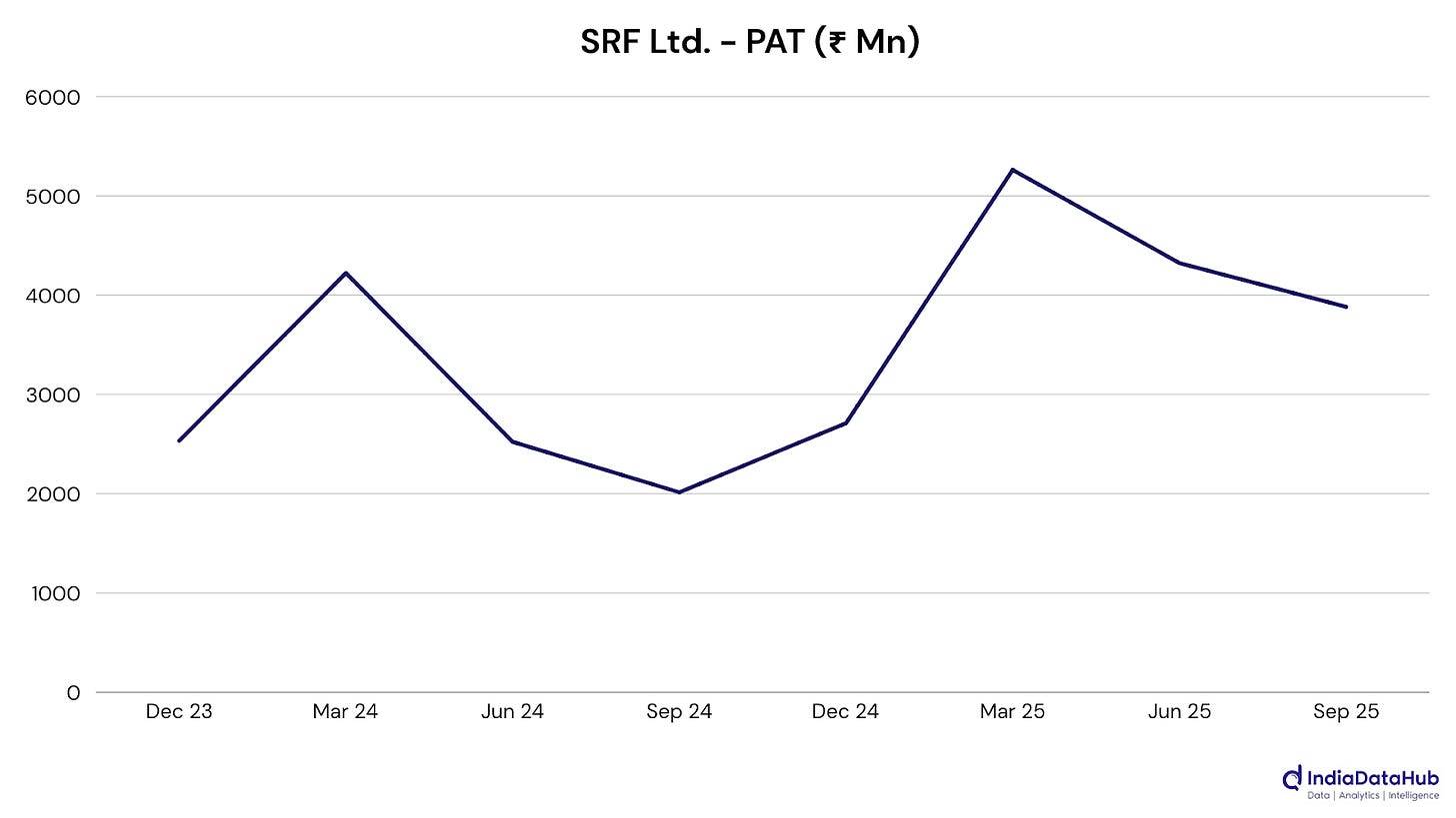 SRF Ltd.: Profits almost doubled as strong chemical sales and tighter cost control lifted margins. Gains in specialty chemicals and polymers offset softness in technical textiles, keeping SRF’s overall performance well-balanced.