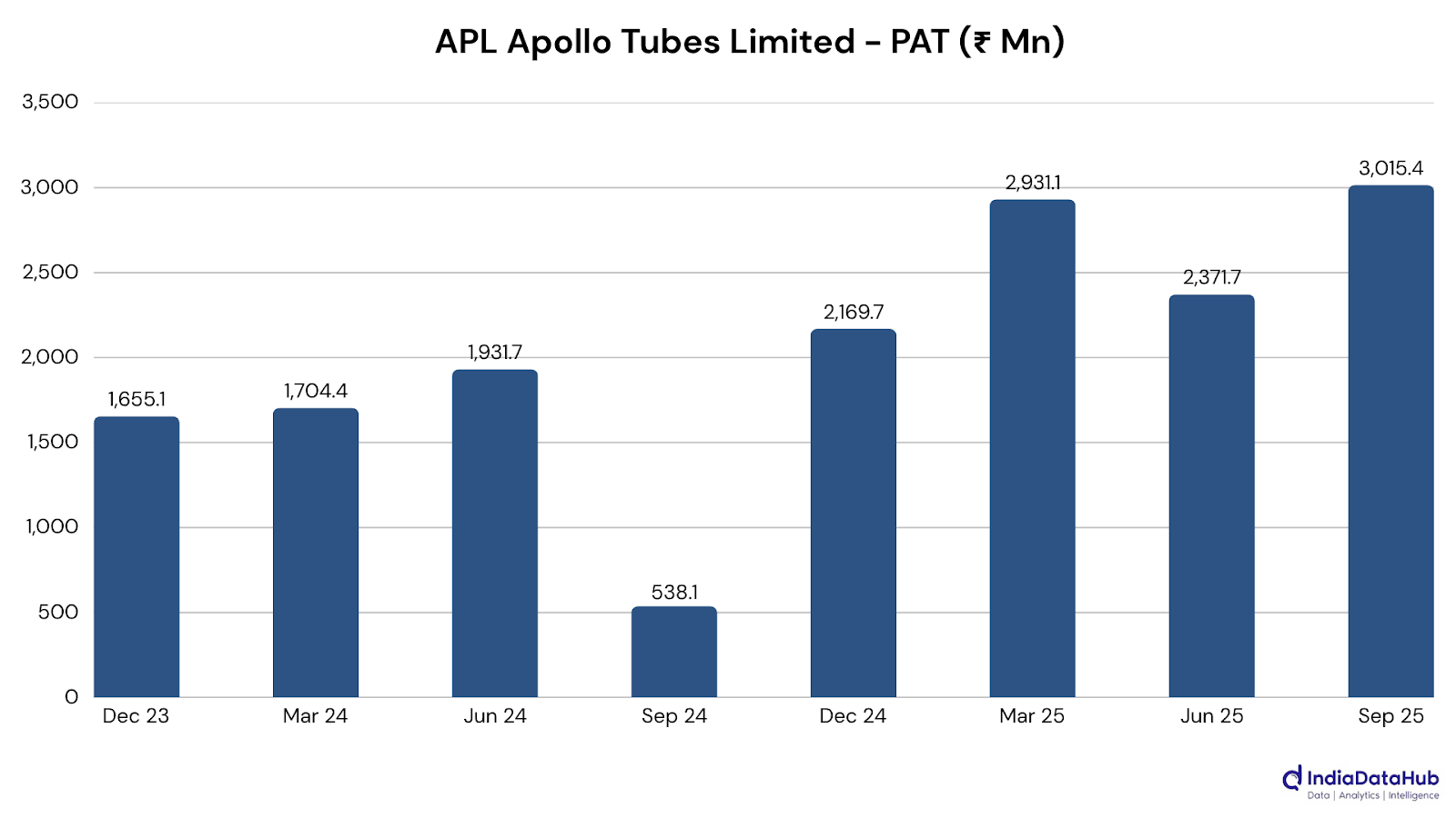 APL Apollo Tubes Limited: Profits shot up, thanks to higher sales volumes and value-added products, which boosted margins. Efficiency gains and tight cost control helped offset weak seasonal demand, keeping APL Apollo firmly ahead in the steel tubes space.