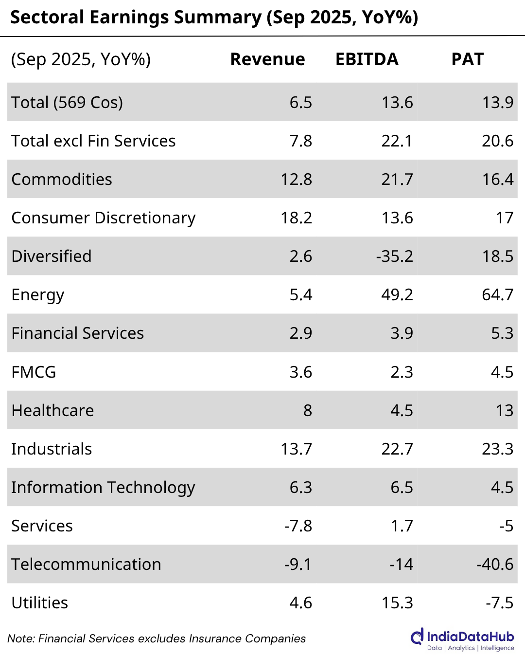 Commodities maintained their strong trajectory, with profits rising 16%, aided by lower input prices and improving realizations. The positive earnings trend was reflected across both cement and specialty chemical makers, highlighting persisting strength in industrial consumption and cost rationalization.