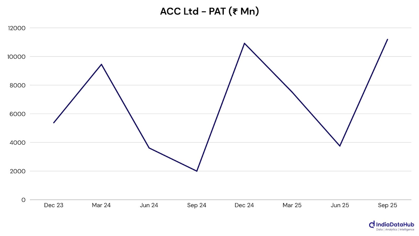 ACC Ltd: The profits surge was helped by a one-off tax credit and robust cement demand. Higher volumes, improved realizations, and lower energy costs pushed margins to new highs, marking one of ACC’s strongest quarters in recent years.