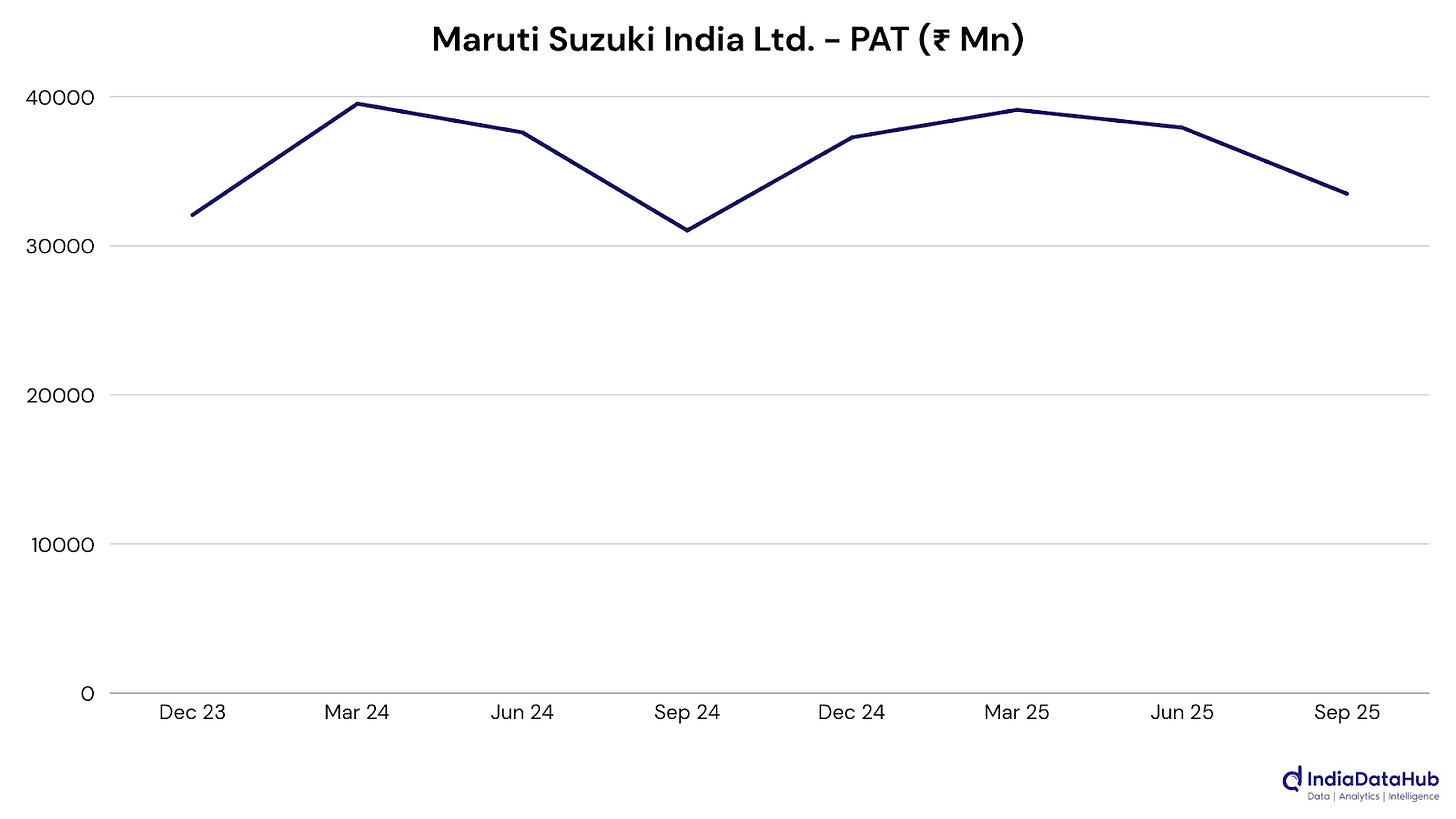 Maruti Suzuki India Ltd.: Revenue hit a record, lifted by booming exports even as domestic sales softened. Margins came under pressure from higher input costs and promotions, but Maruti’s global momentum kept overall growth steady.