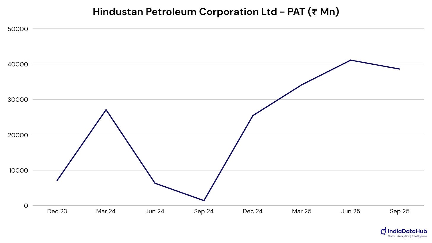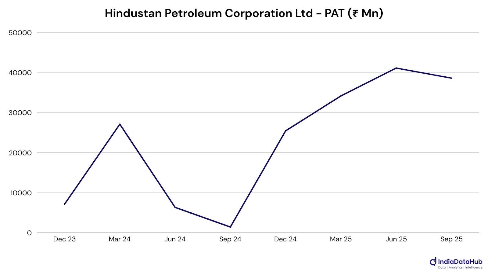 Bharat Petroleum Corpn. Ltd. (BPCL): Profits nearly tripled, powered by stronger refining margins and tight expense control. Softer crude prices and steady product spreads kept conditions favorable for refiners, helping BPCL sustain high profitability despite a modest topline growth.