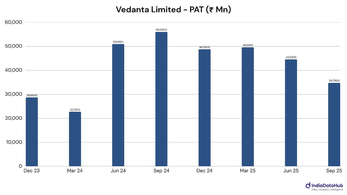 Vedanta Limited: Revenue rose modestly, but profits fell sharply due to one-time asset write-offs and settlements. Strong aluminium and power sales kept core operations steady, with disciplined cost control helping cushion Vedanta’s bottom line.