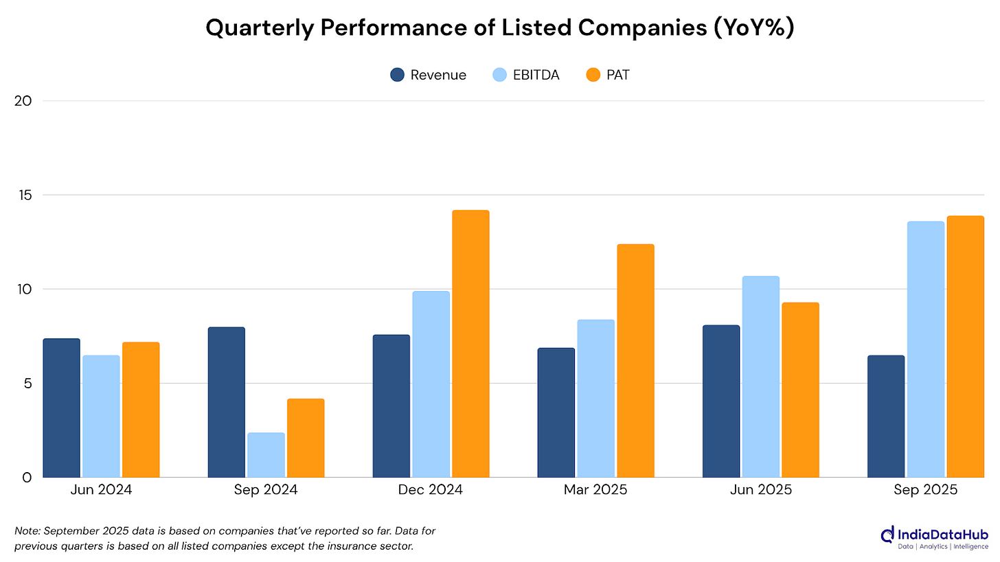 Welcome back to This Week in Earnings. The Q2 FY26 results season has picked up further pace, with a sharper rebound across most sectors. As of Friday a total of 569 companies have reported results. Aggregate revenues have grown rose 6.5% year-on-year, while EBITDA and PAT have seen a 13.6% and 13.9% growth respectively. Excluding Financial Services, profit growth has seen an even stronger growth of 20%, highlighting the broad-based momentum despite a cautious consumption backdrop.
