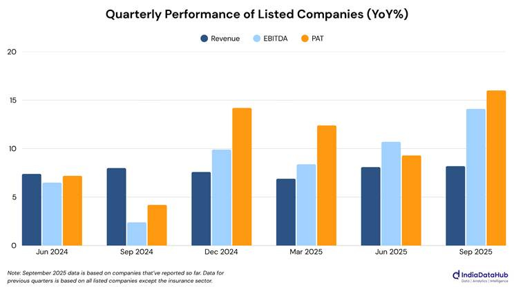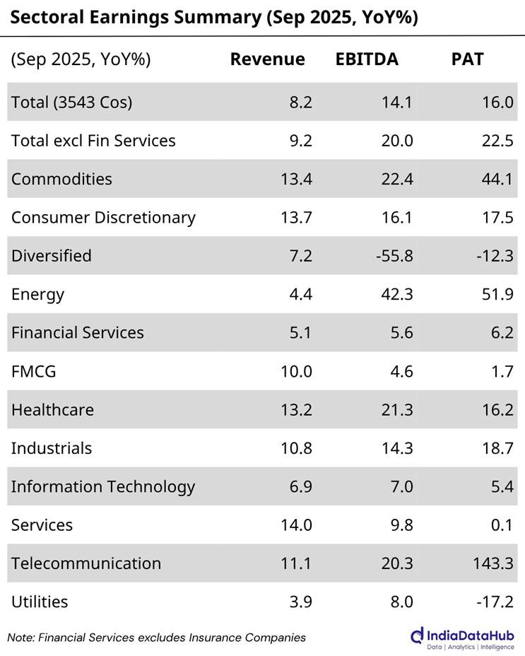 Welcome back to This Week in Earnings. We are almost at the end of the 2Q FY26 reporting season which saw a flurry of companies reporting. Over 3500 companies have reported the results, and the trends are now fairly representative. And the numbers reinforce just how broad the recovery has become. Aggregate revenues have risen 8.2% year-on-year, while EBITDA and PAT climbed 14.1% and 16.0%, respectively. Excluding Financial Services, profit growth accelerated to 22.5%, driven largely by margin gains rather than pure volume strength, a pattern that has defined much of this season so far.