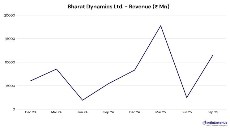 Bharat Dynamics Ltd. (Industrials): Delivered a standout quarter, with revenue more than doubling and profit jumping as missile programme execution picked up pace. Rising material costs followed the ramp-up, but order momentum still seems firmly intact. A thick defence order book and fresh missile contracts, such as the Invar deal, are likely to give Bharat Dynamics unusually clear multi-year visibility. If execution stays on track, that pipeline could smooth out year-to-year lumpiness and keep utilisation high.