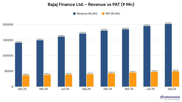 Bajaj Finance Ltd. (Financial Services): Delivered another strong quarter, with revenue and profit rising at a healthy clip as loan growth stayed broad-based, fees and NII picked up, and cleaner asset quality kept credit costs in check. Digital onboarding and product diversification continued to push the franchise’s usual momentum.