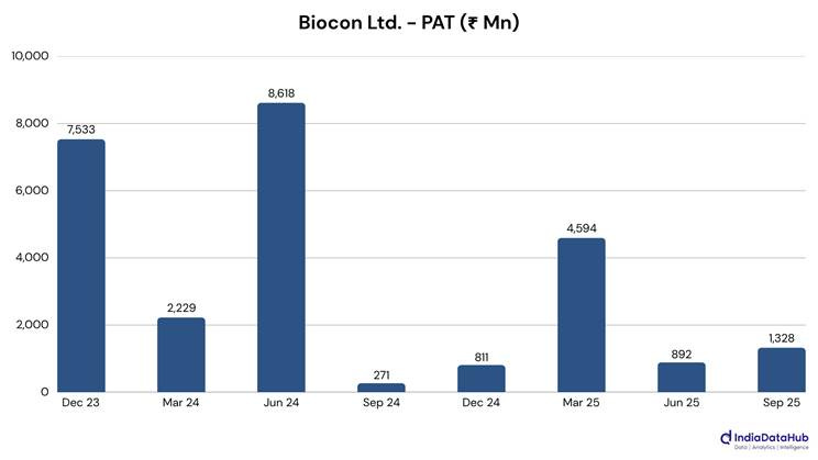 Biocon Ltd. (Healthcare): Delivered a standout quarter, with healthy revenue growth turning into an outsized profit surge as biologics and generics gained scale, biosimilars lifted the mix, and last year’s one-offs fell out of the base. Stronger contributions from Syngene and steady regulatory approvals helped deepen operating leverage, resulting in a cleaner, more profitable print this time around.