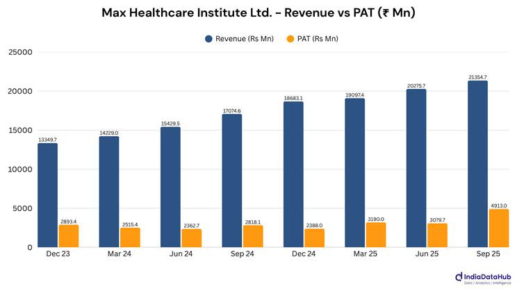 Max Healthcare Institute Ltd. (Healthcare): Enjoyed a strong quarter with higher patient volumes, better occupancy, and rising revenue per bed, all pushing margins up. Diagnostics and home care are also adding significant weight, making the overall network look more balanced than before.