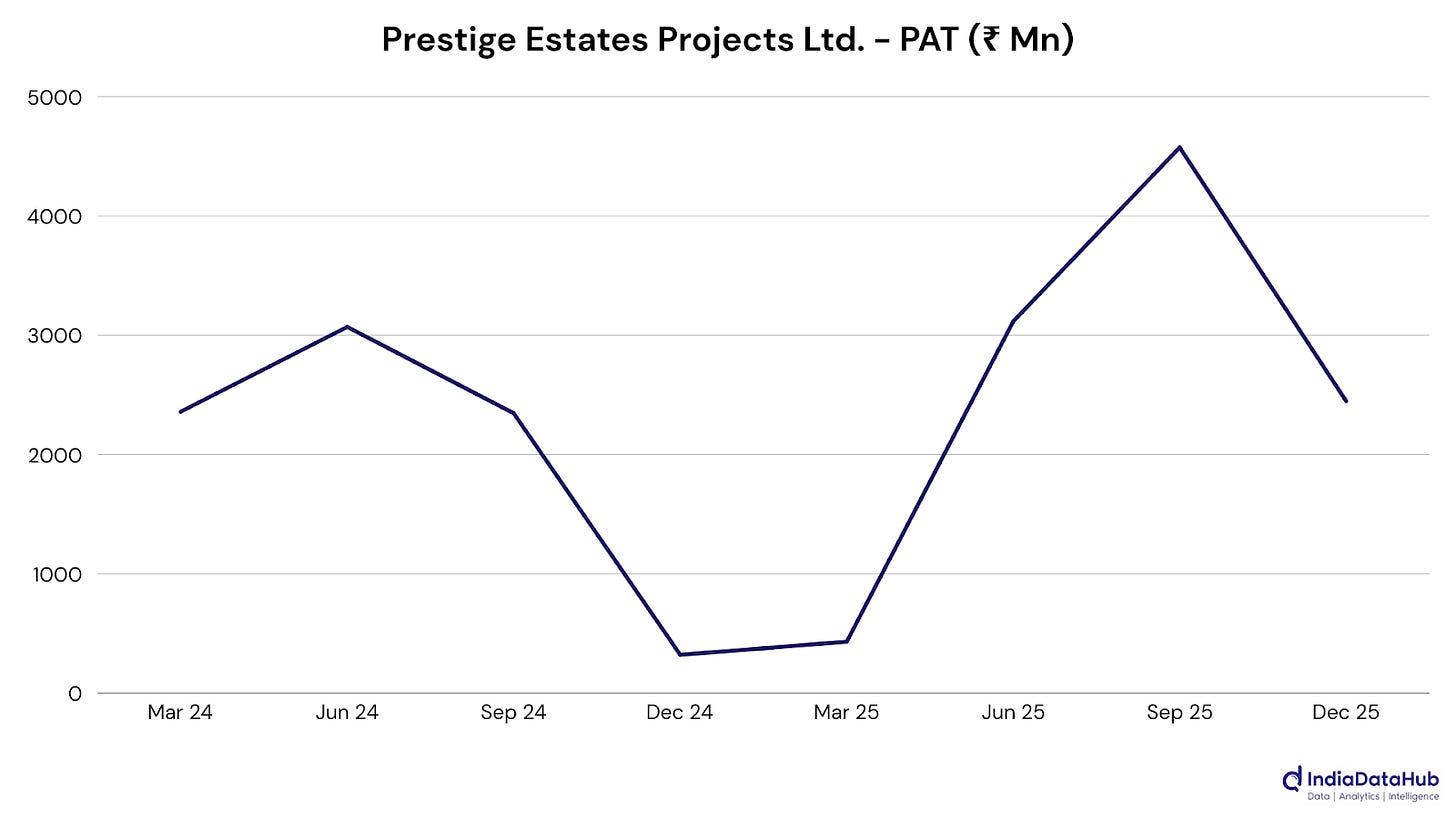 Prestige Estates Projects Ltd. (Consumer Discretionary): Revenue more than doubled to ₹38,726 mn (+134% YoY) and profit surged to ₹2,447 mn (+660% YoY), helped by faster project handovers plus strong pre-sales and collections. The spike could also reflect lumpy revenue recognition after timely completions and launches.