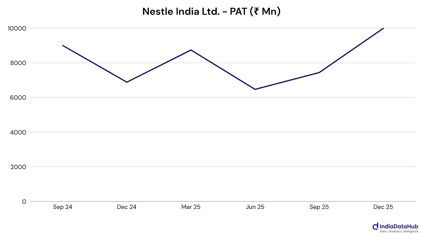 Nestle India Ltd. (FMCG): Revenue climbed 18.6% YoY to ₹56,670 mn and profit jumped 45.1% to ₹9,984 mn, helped by volume-led growth, strong confectionery/beverages, operating leverage, and a lower tax rate. This may point to steady brand pricing power and mix improvement.