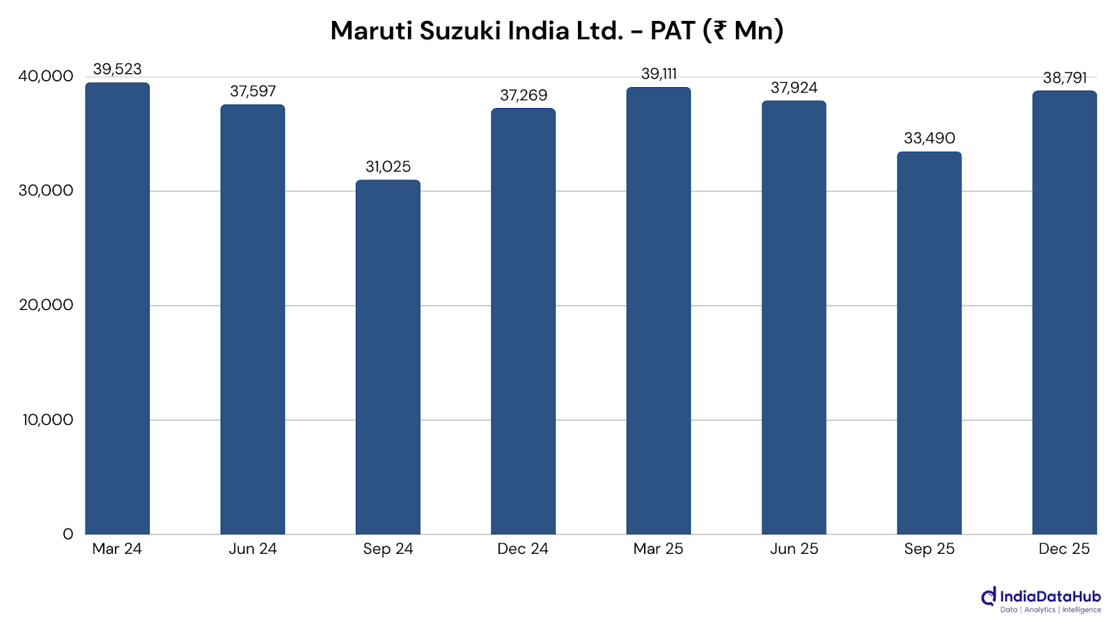Maruti Suzuki India Ltd. (Consumer Discretionary): Revenue surged 28.7% YoY to ₹499,041 mn on record volumes, but profit rose only 4.1% to ₹38,791 mn as higher costs and a one-time labour-code provision squeezed margins. It hints that growth is coming through units, while profitability is being capped by pricing and mix.
