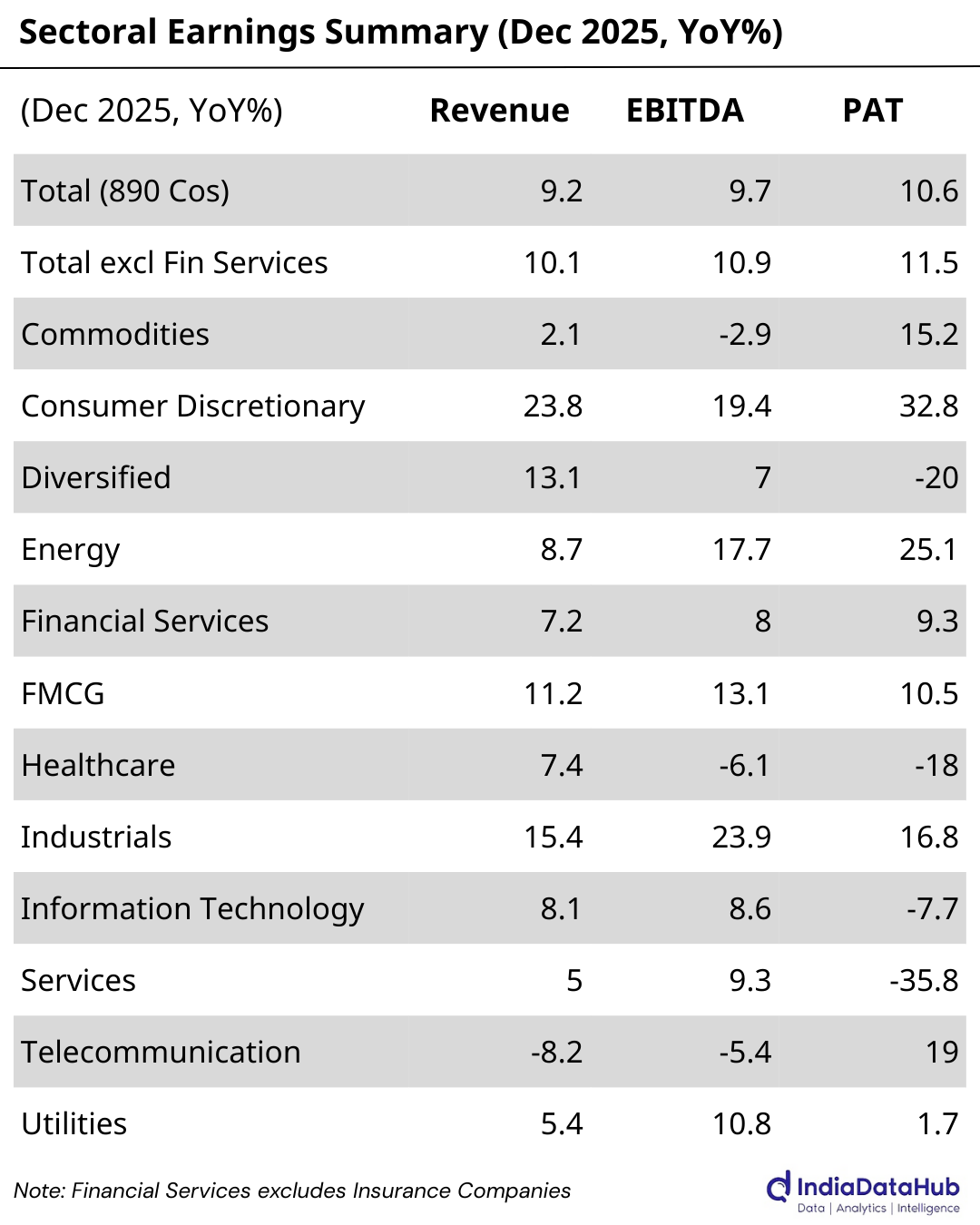 Consumer Discretionary remains the clearest outperformer, with revenue up 23.8% translating into 32.8% profit growth, highlighting strong demand conditions and operating leverage. Energy is another standout, where EBITDA growth (17.7%) and PAT growth (25.1%) are comfortably ahead of revenue growth (8.7%), pointing to strong margin support.