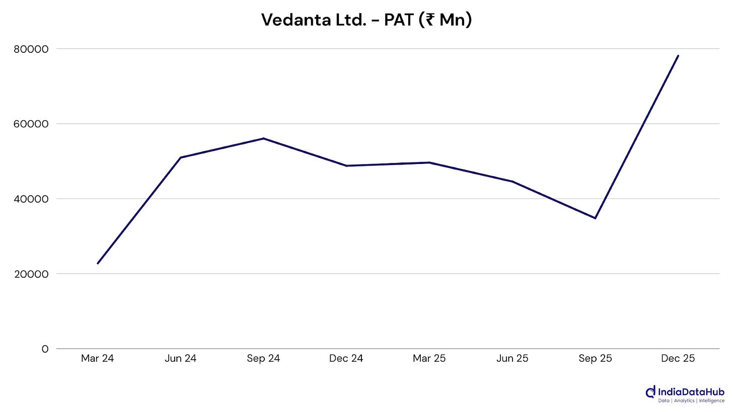 Vedanta Ltd. (Commodities): Revenue dropped 40.3% YoY to ₹233,690 mn, yet profit rose 60.1% to ₹78,070 mn, aided by strong EBITDA and record alumina/aluminium and zinc-silver output. It likely reflects richer realizations and forex tailwinds offsetting weaker oil & gas.
