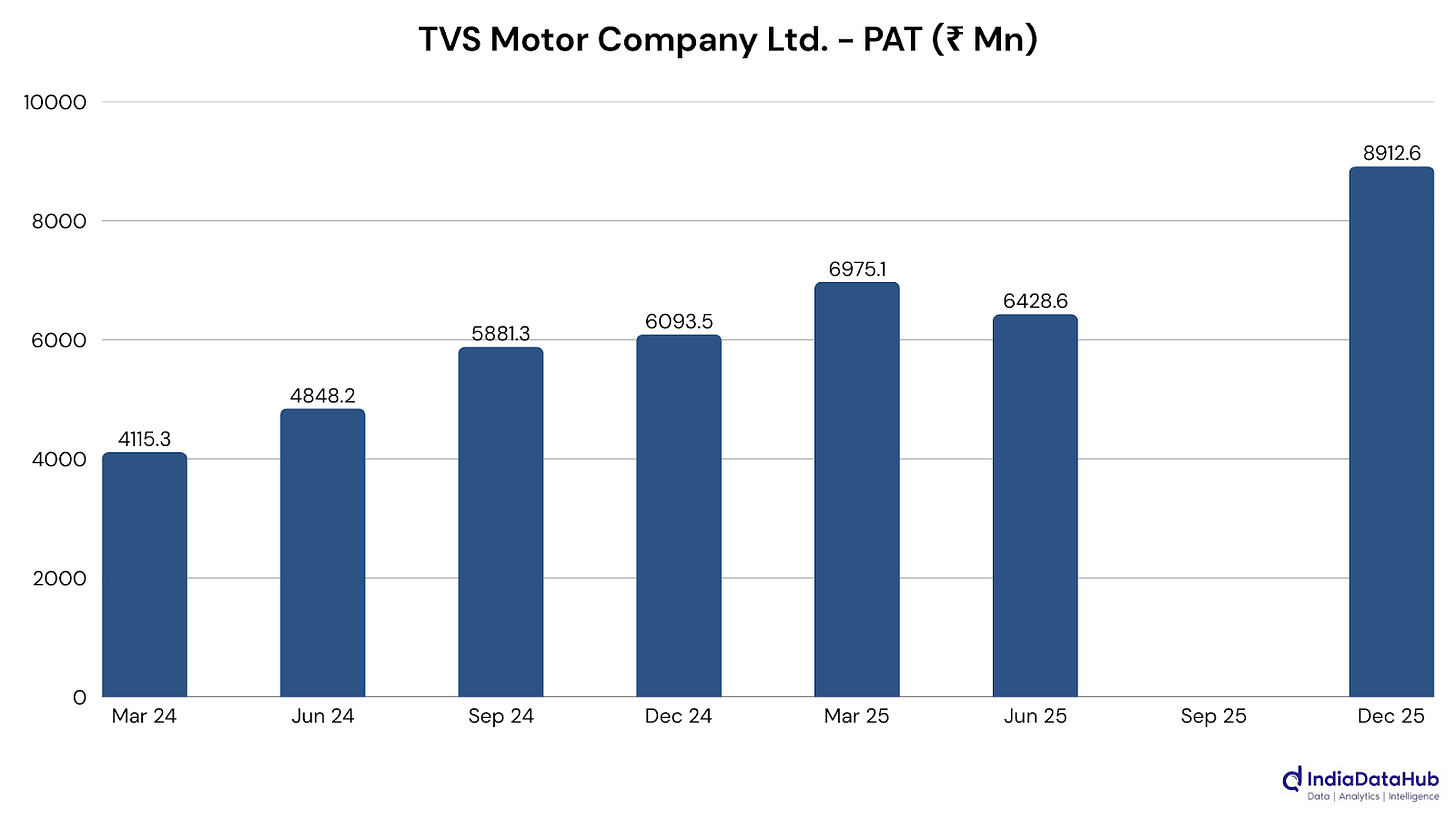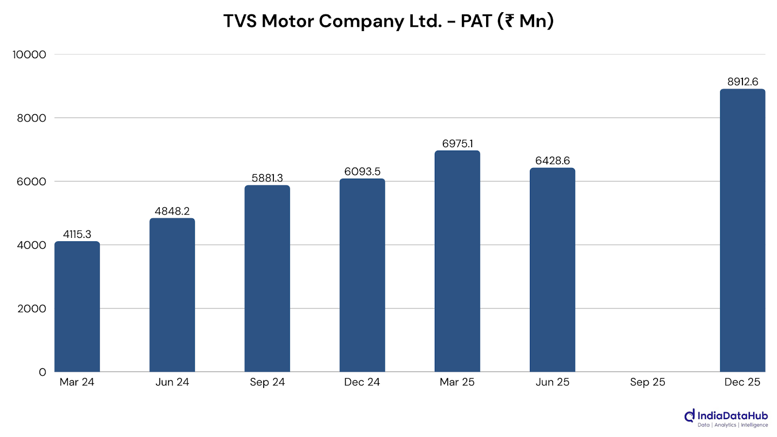 TVS Motor Company Ltd. (Consumer Discretionary): Revenue jumped 32.5% YoY to ₹147,555 mn and profit rose 46.3% to ₹8,913 mn, powered by record volumes, a sharp EV ramp, and strong exports. The margin lift suggests mix and operating leverage improved, not just unit growth.