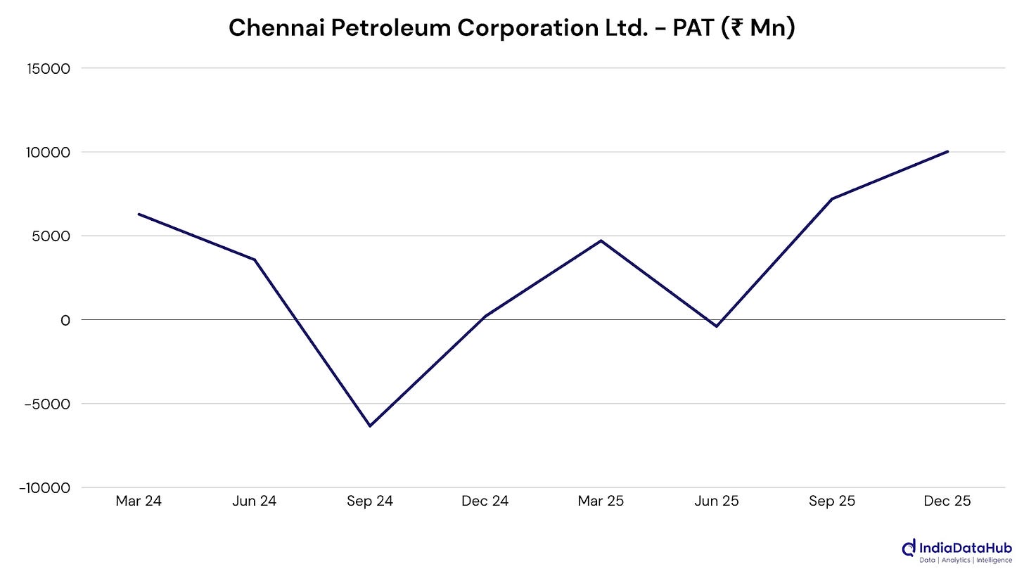 Chennai Petroleum Corporation Ltd. (Energy): Revenue rose 23.9% YoY to ₹194,384 mn, while profit jumped to ₹10,016 mn from a low base as GRMs improved sharply and throughput ran above nameplate capacity. This quarter seems driven more by margin cycle and product cracks than by pure volume growth.