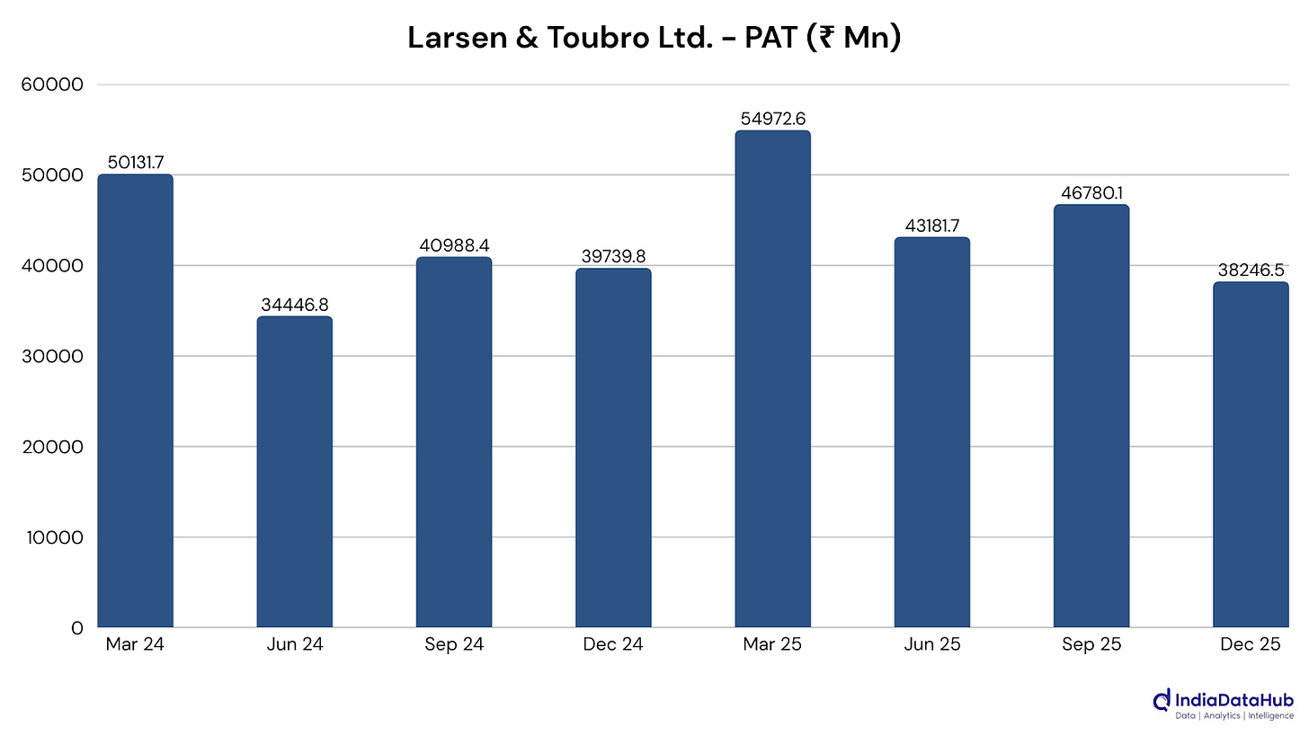 Larsen & Toubro Ltd. (Industrials): Topline stayed healthy. Revenue rose 10.5% YoY to ₹714,497 mn, and EBITDA improved, but profit dipped 3.8% to ₹38,247 mn due to a one-time labour-code provision. Strip that out, and the quarter seems more robust, backed by strong order inflows.