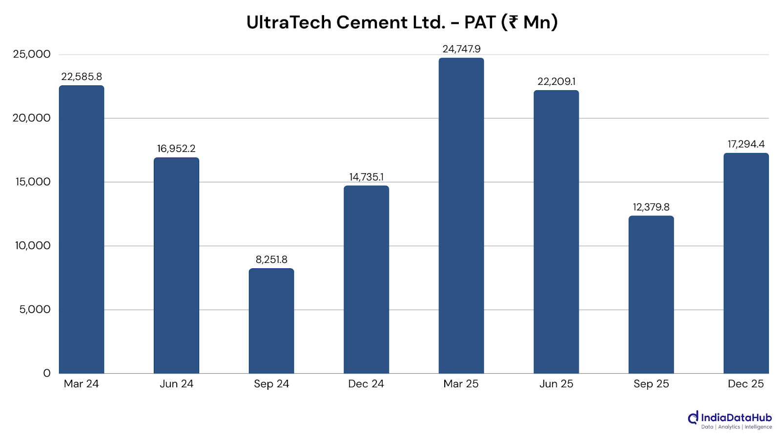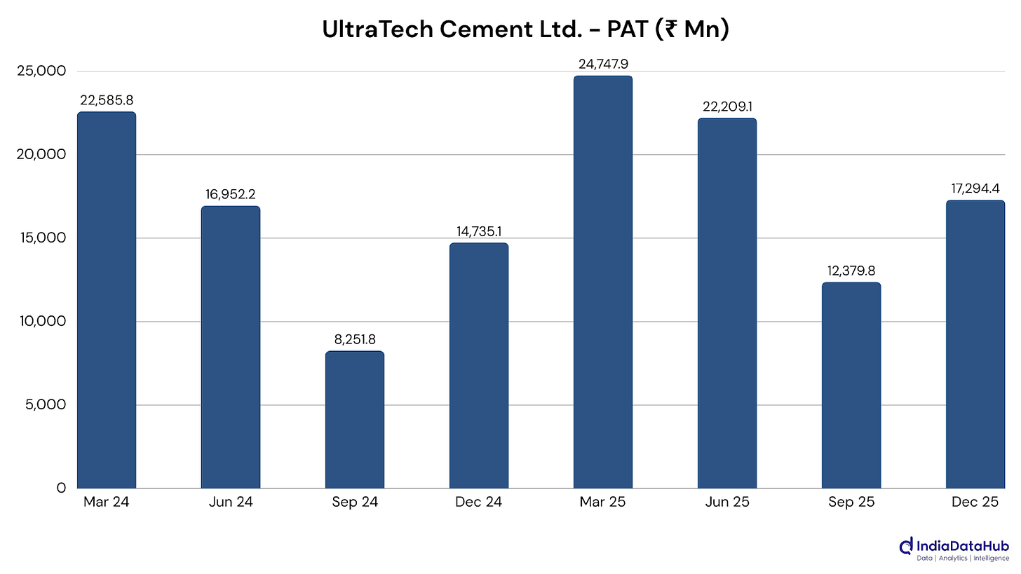 UltraTech Cement Ltd. (Commodities): Revenue jumped 27% YoY to ₹218,297 mn and profit rose 17.4% to ₹17,294 mn, driven by record volumes and EBITDA growth despite a labour-code provision. It may indicate scale-led operating leverage and early synergies from integration, helping cushion a still-competitive pricing backdrop.
