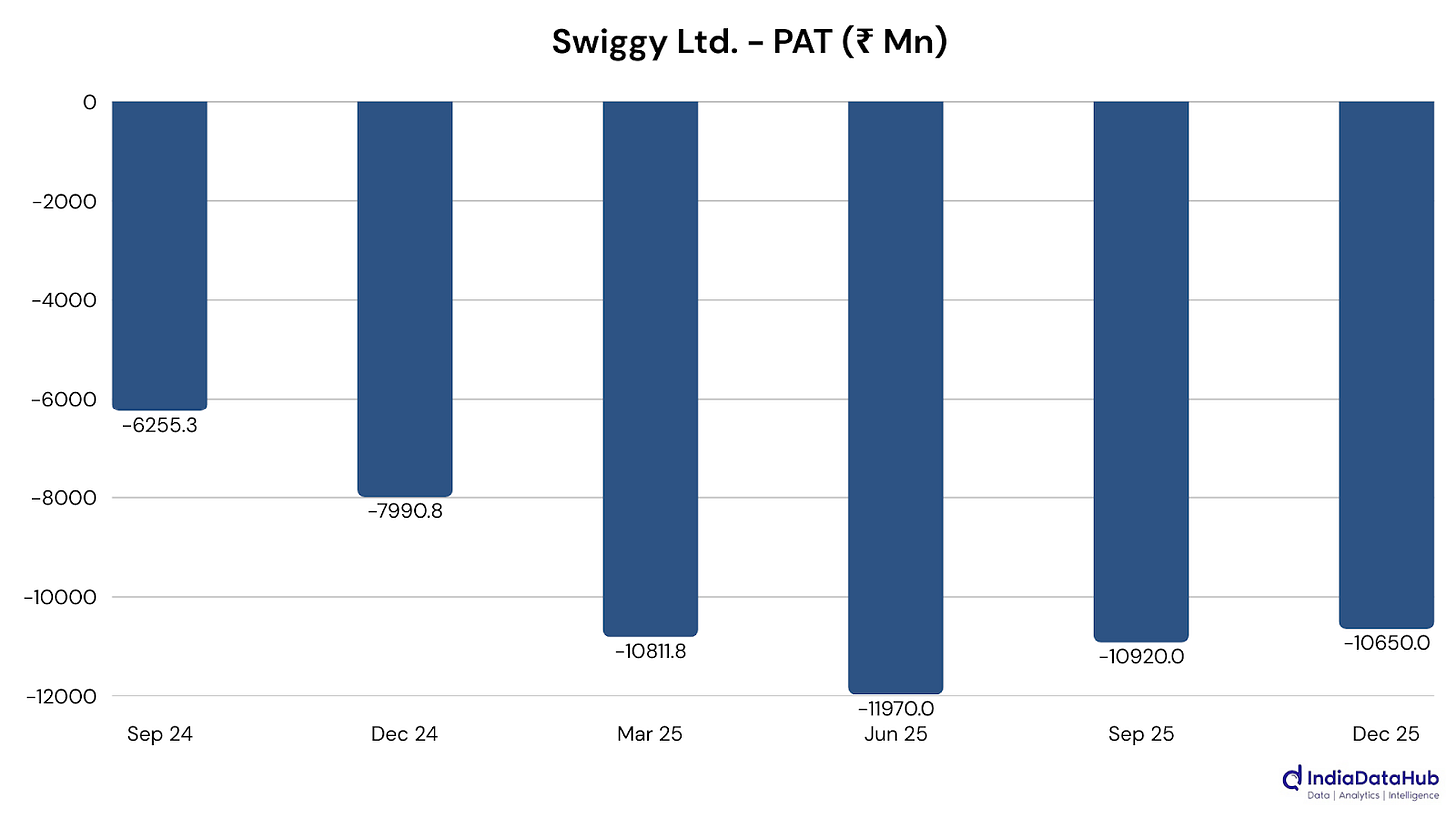 Swiggy Ltd. (Consumer Discretionary): Revenue surged 54% YoY to ₹61,480 mn, led by Instamart’s rapid scale-up alongside steady food delivery growth. Loss widened to ₹10,650 mn as spending rose on dark stores and fleet expansion, likely the near-term cost of pushing quick commerce harder.