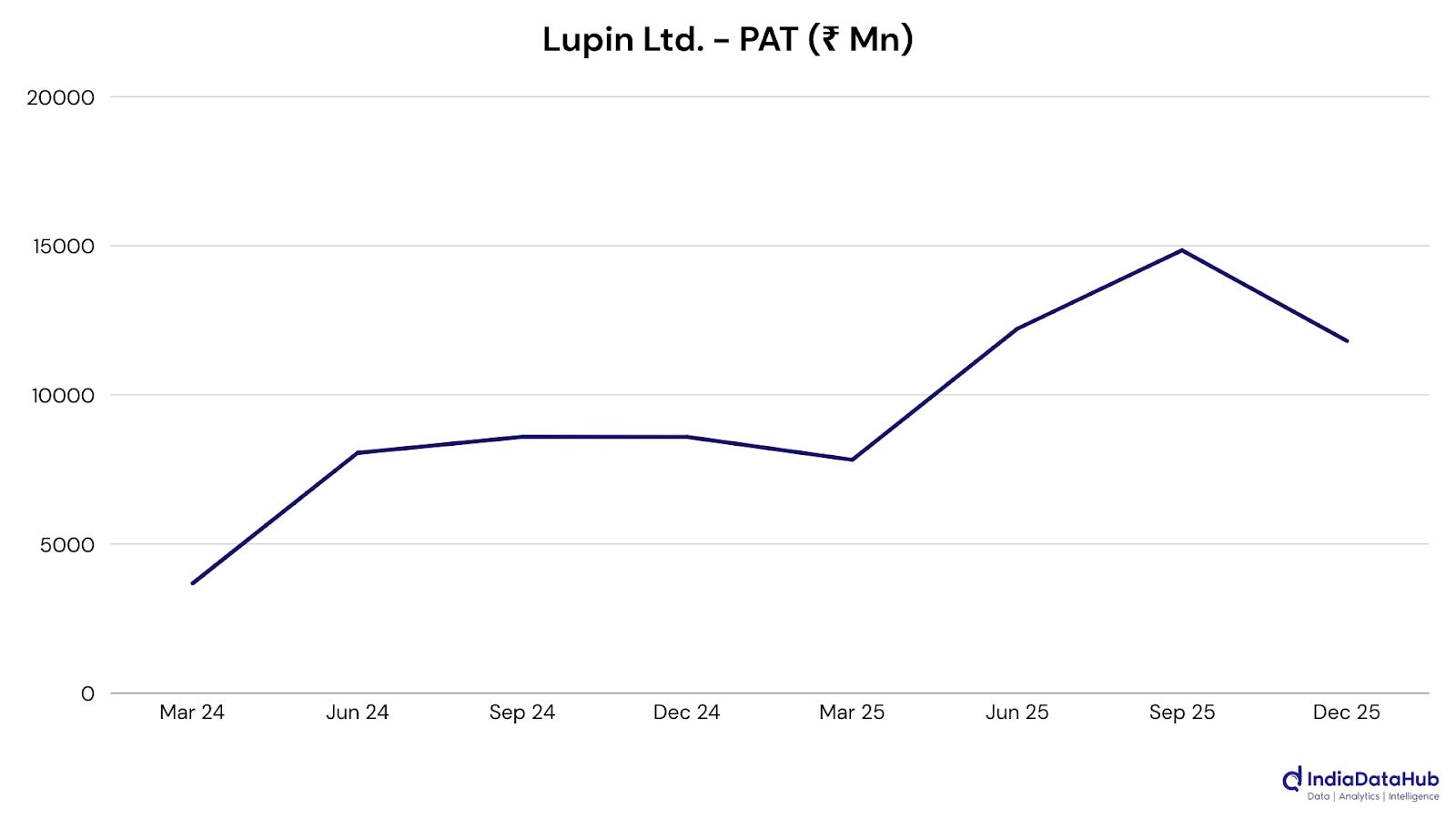 Lupin Ltd. (Healthcare): A standout quarter as revenue jumped 24%, and profit rose 38%, with the US business surging 54% and margins expanding sharply (EBITDA margin ~33.5%, up 840 bps). This looks like a launch-led US run plus a healthier mix and execution.