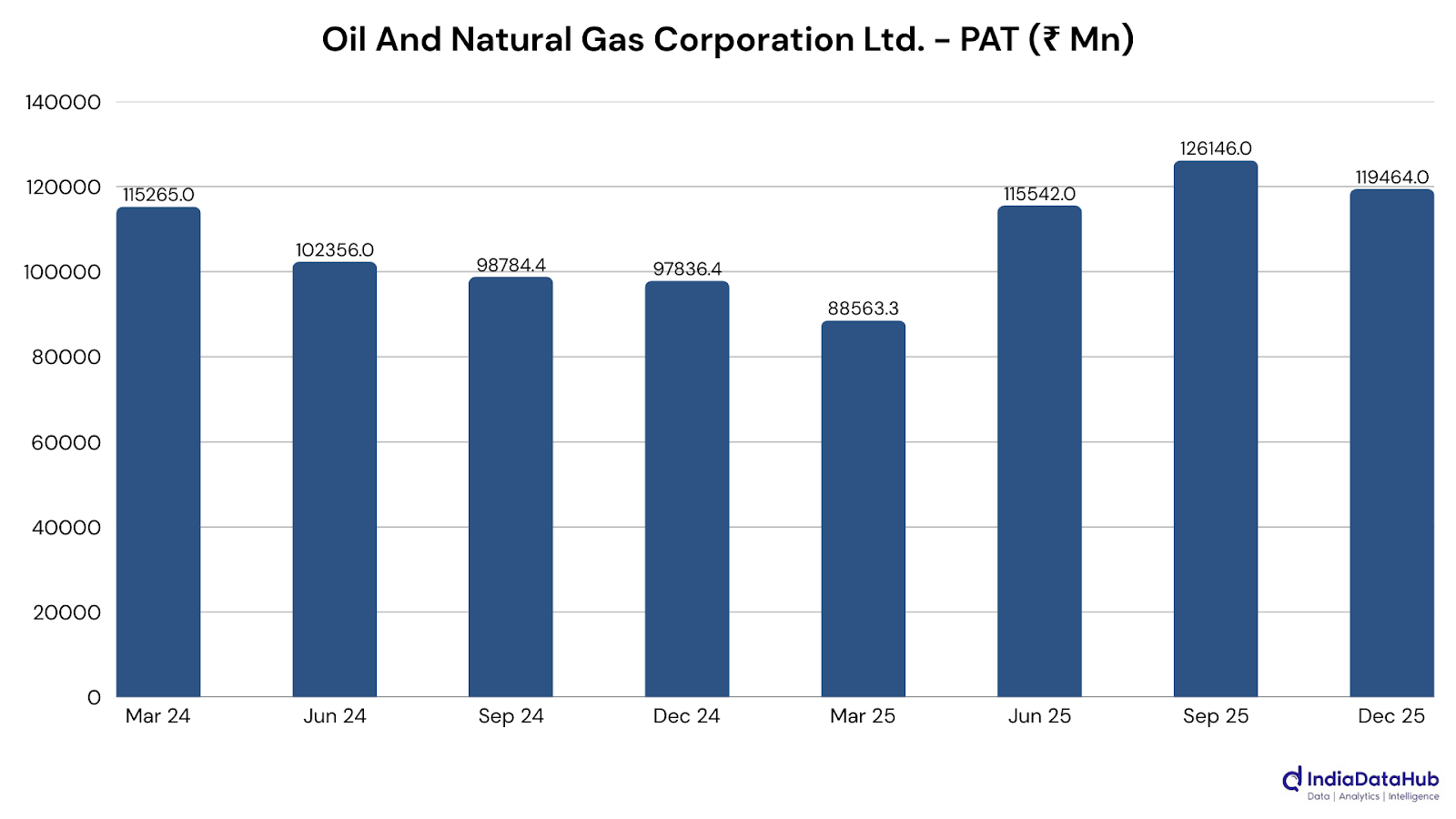 Oil And Natural Gas Corporation Ltd. (Energy): Topline was basically flat, but profit rose 22% even with crude realizations down ~15% and production steady. That resilience seems tied to tighter costs, steadier gas pricing, and help from subsidiaries/JVs.