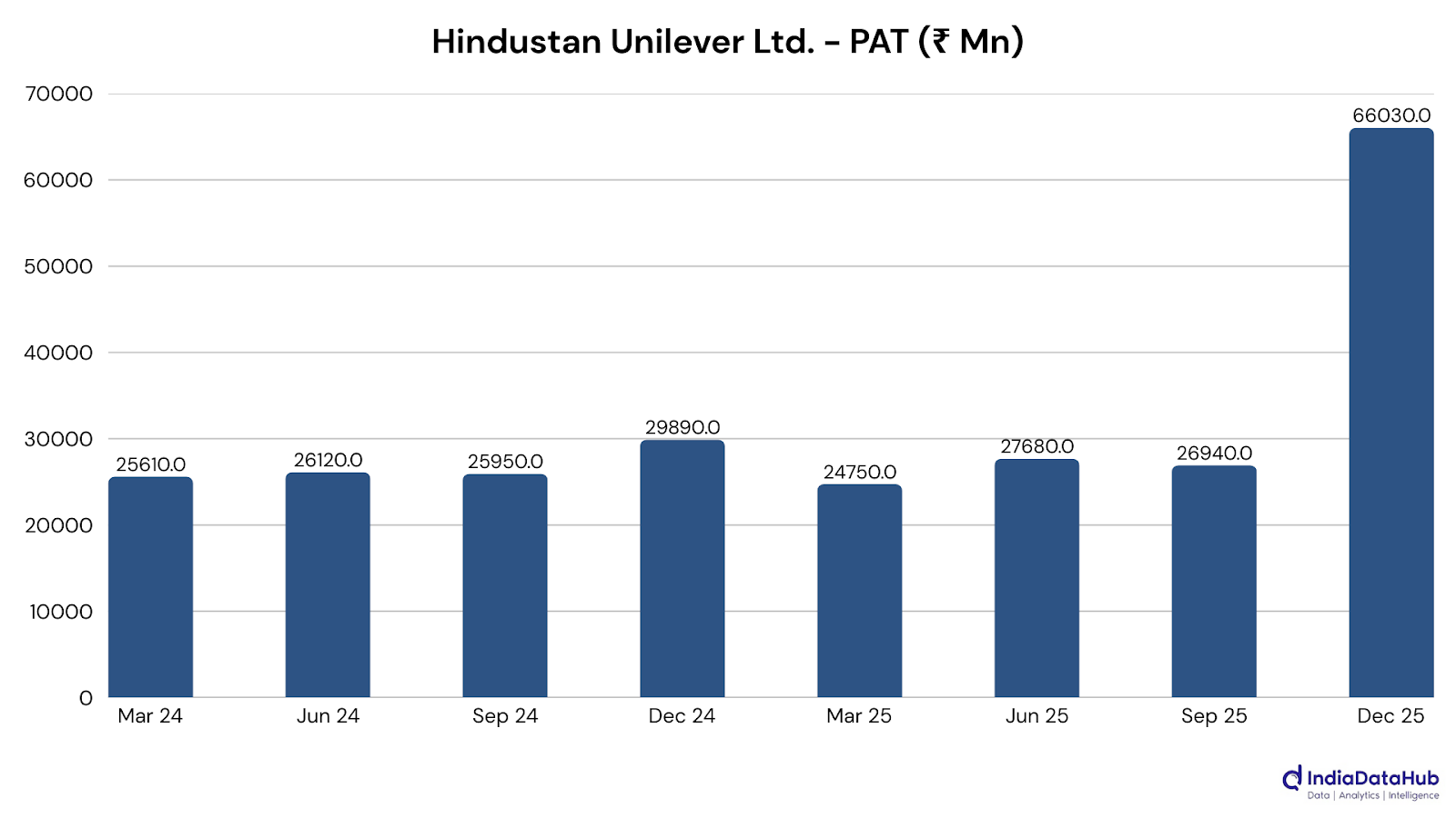 Hindustan Unilever Ltd. (FMCG): The headline print (profit surging 121%) is doing a lot of heavy lifting via the ice-cream demerger gain, so it’s worth separating the two stories. The operating business looks much more muted: low-single-digit revenue growth with steady volumes, but profitability appears under pressure as margins compressed and brand investments rose. The next few quarters hinge on how quickly pricing actions and cost inflation settle, and whether volume growth can stay resilient without leaning on promotions, because without the exceptional item, earnings momentum seems far less dramatic.
