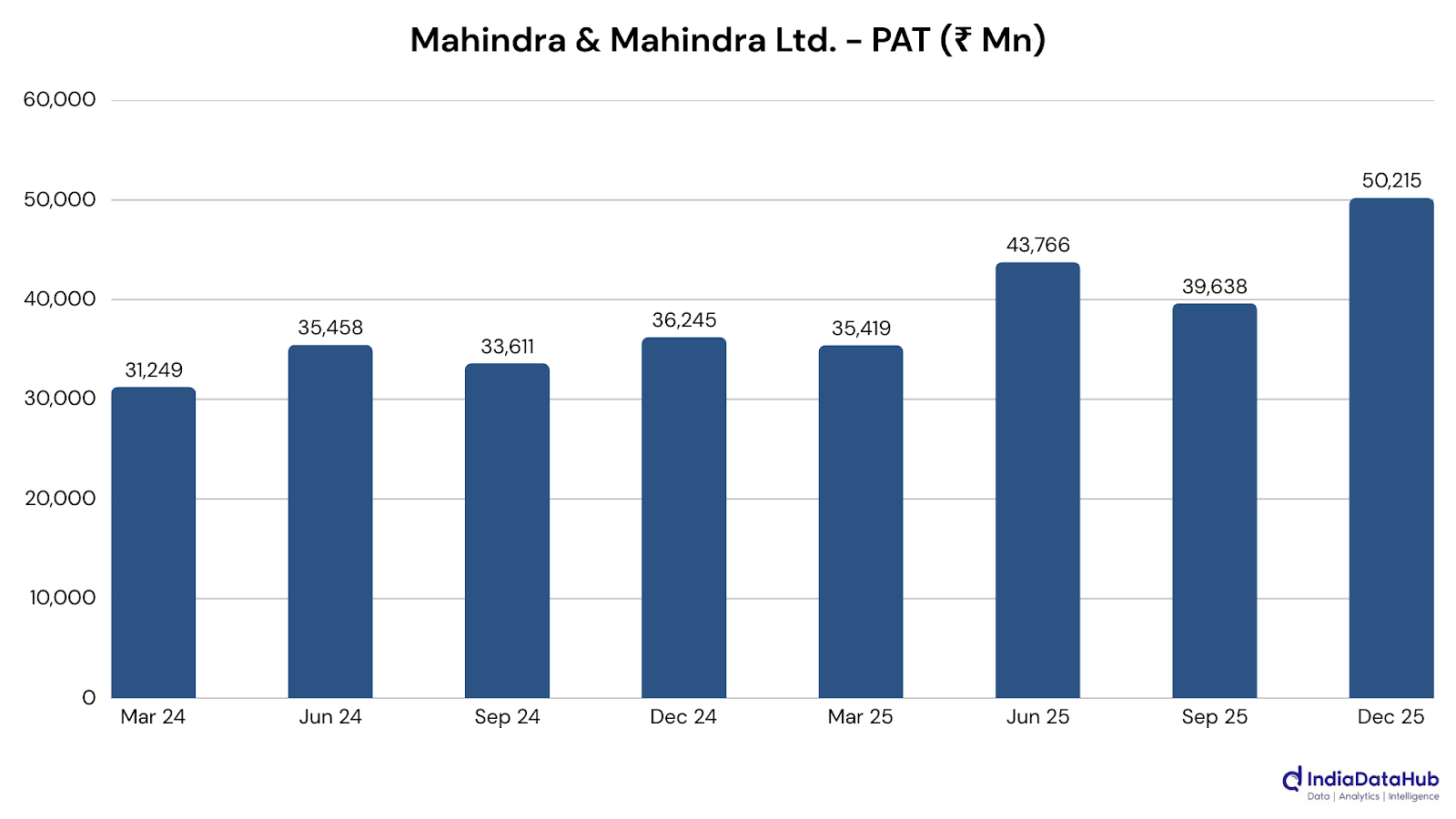 Mahindra & Mahindra Ltd. (Consumer Discretionary): SUVs and tractors both posted ~23% volume growth, pushing revenue up 26% and PAT up 39%. The margin hold at ~14.7% (despite the labour-code hit) hints that mix and scale are helping. Momentum seems to be coming from stronger SUV traction and a firmer rural backdrop; the next tell will be whether pricing and input costs stay supportive as volumes normalise.