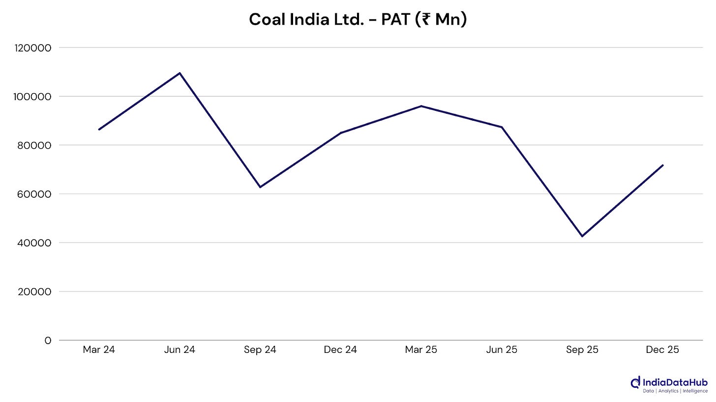 Coal India Ltd. (Energy): Revenue slipped 2% and profit fell 16% as offtake and output softened and realizations eased; pay-revision provisions pushed employee costs up, crimping EBITDA. The pattern may hint at weaker demand and a tougher cost base.