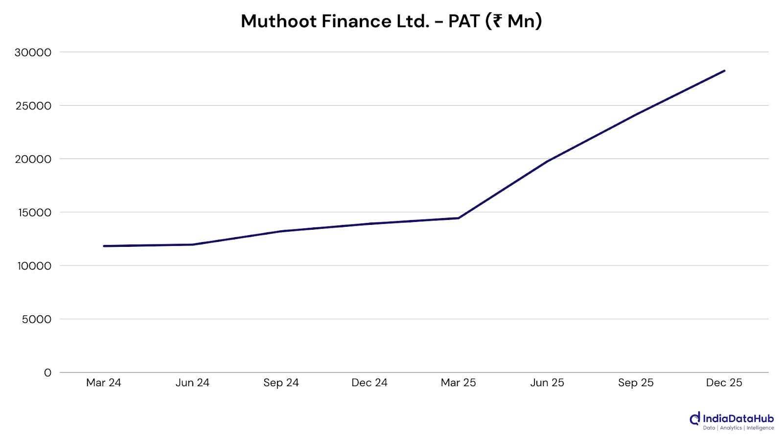 Muthoot Finance Ltd. (Financial Services): Profit more than doubled as gold-loan AUM expanded ~50% and NII jumped 64%, lifting revenue 58% YoY. Momentum may have been boosted by higher gold prices and festive demand, with easing funding costs adding a tailwind.