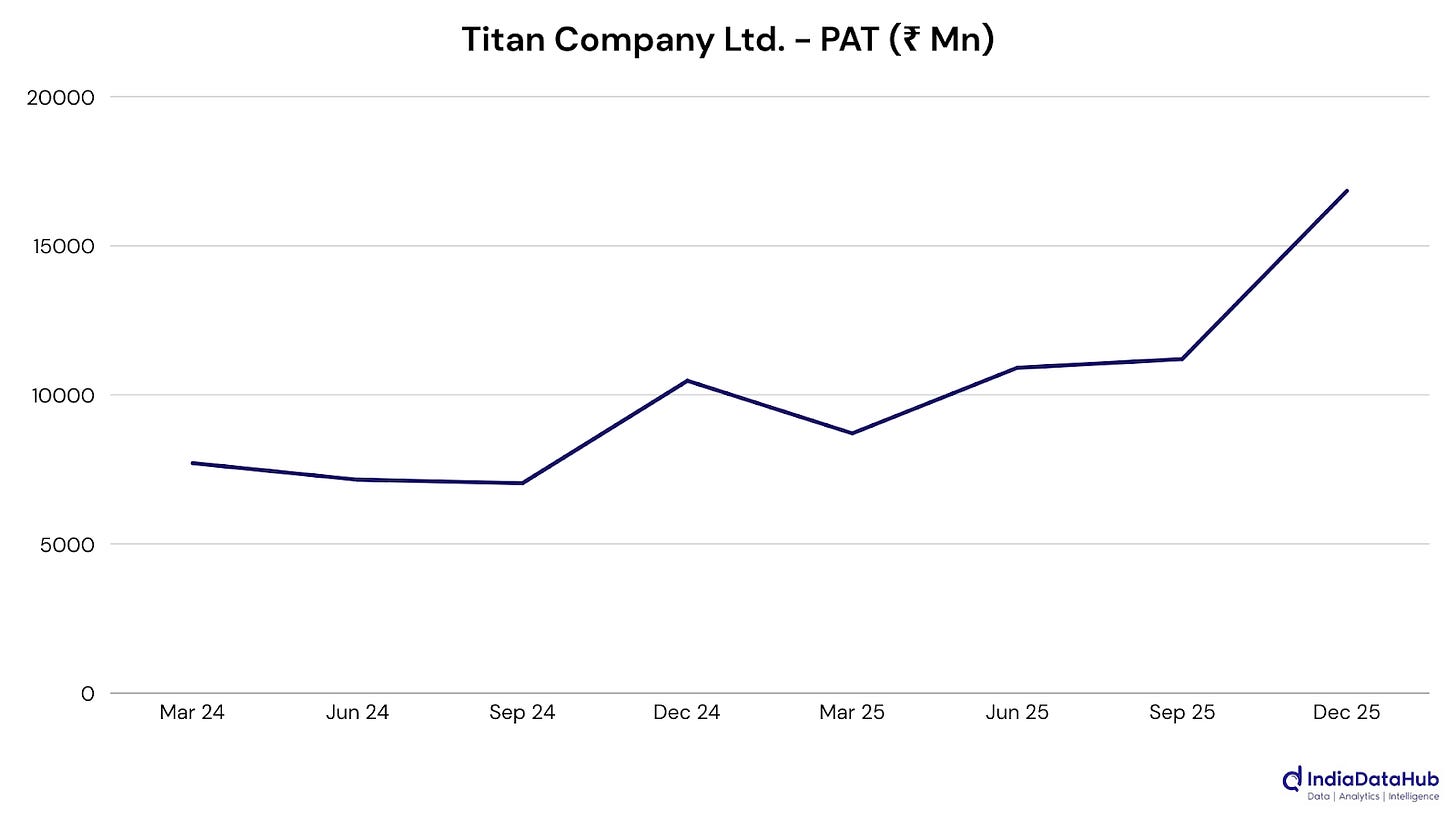 Titan Company Ltd. (Consumer Discretionary): A big festive quarter: revenue up 43% and profit up 61%, led by jewellery’s 42% growth across Tanishq/Mia/Zoya and CaratLane. Margin expansion suggests operating leverage; the shift toward organised, premium jewellery may be helping despite high gold prices.