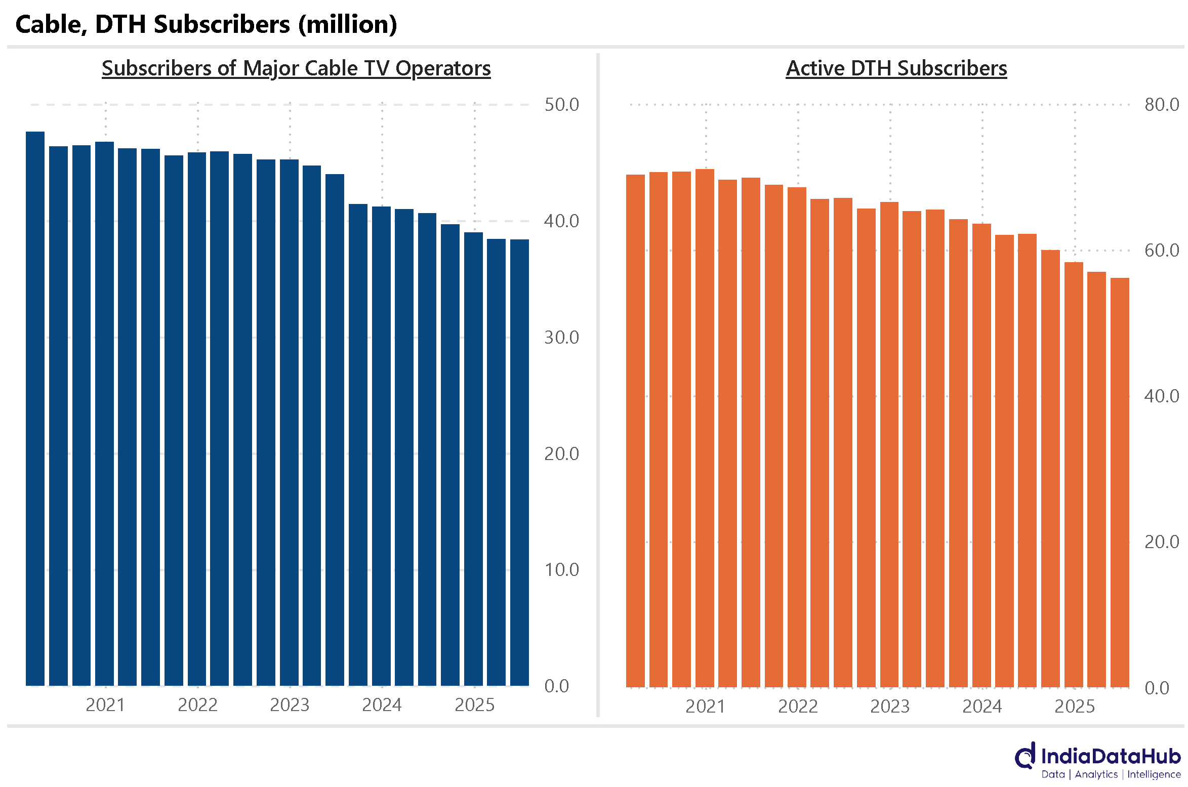 One flipside of this, though, is cord-cutting. The number of users on DTH or Cable TV continues to decline. In the last 5 years, the number of DTH and Cable subscribers have declined by 20%.