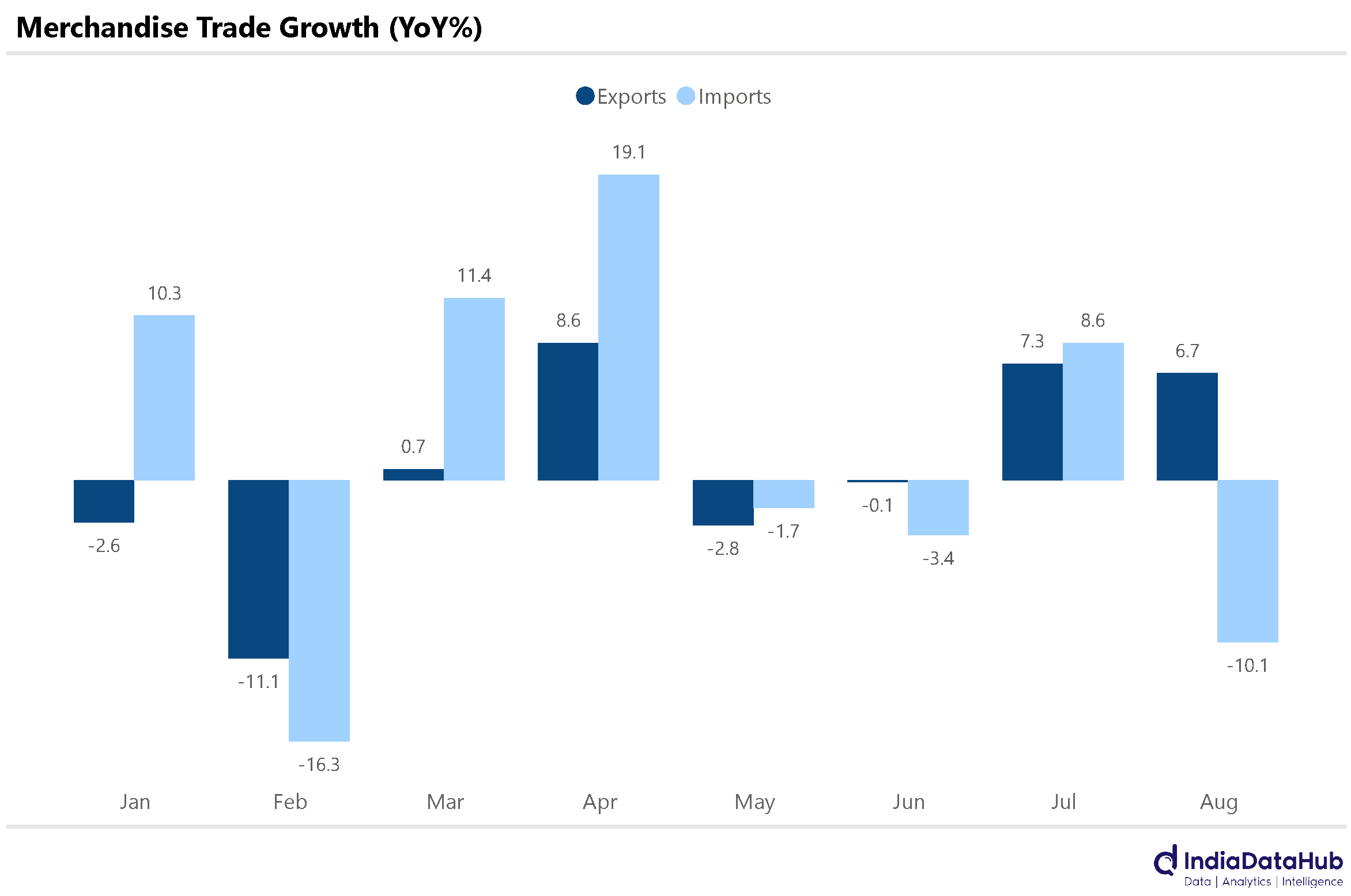 Merchandise exports grew by 7% YoY in August, the second consecutive month of high single digit growth. Exports had grown by a similar magnitude in July as well. Electronic goods and Gems & Jewellery were the fastest growing items with exports growing 25% and 15% respectively in August. These two categories contributed almost a third of the growth in exports in August.