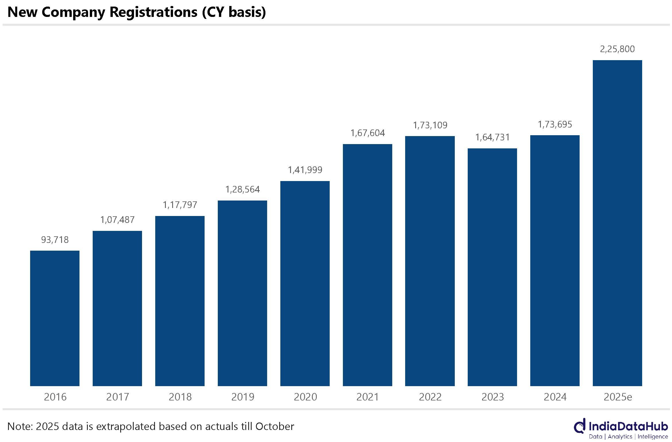 2025 is turning out to be a very strong year for startups (new company registrations). In the first 10 months of this year (Jan-Oct), a total of 192k new companies were registered in the country. This is an increase of 30% YoY. At this rate, a total of 225k new companies would get registered in India, the highest ever, and the first time over 200k companies would be registered in any year.