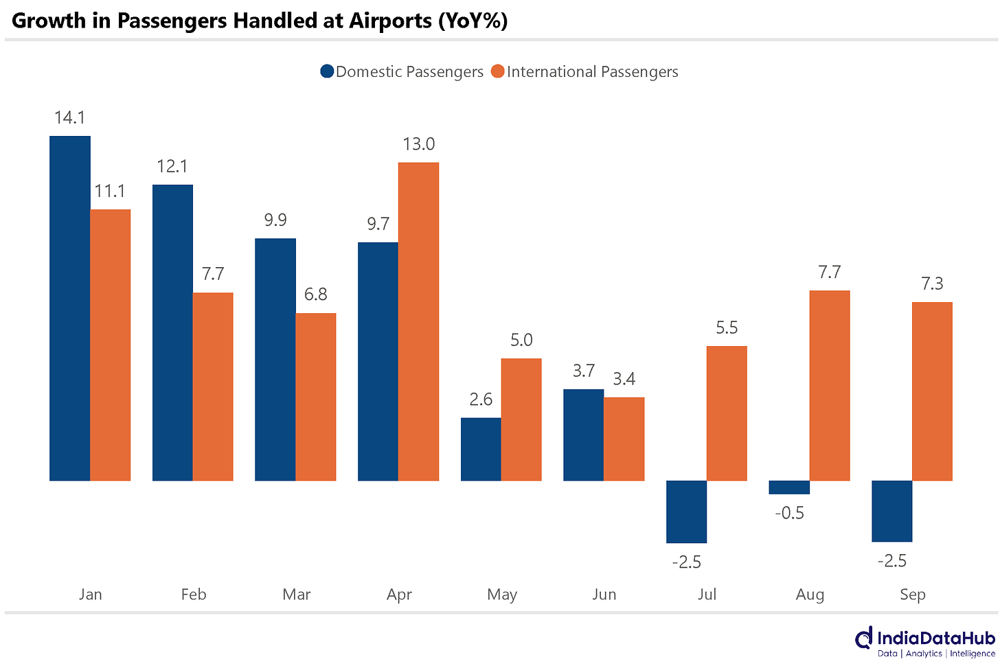 In sync with this, the total domestic passengers handled by the airports declined by 2% YoY in September, the third consecutive month of decline. International passengers handled grew by in the high single digits for the second consecutive month; however, despite this, the total passengers handled at all the airports declined by 1% in September, the second time in the last three months that total passenger throughput has declined on a YoY basis.