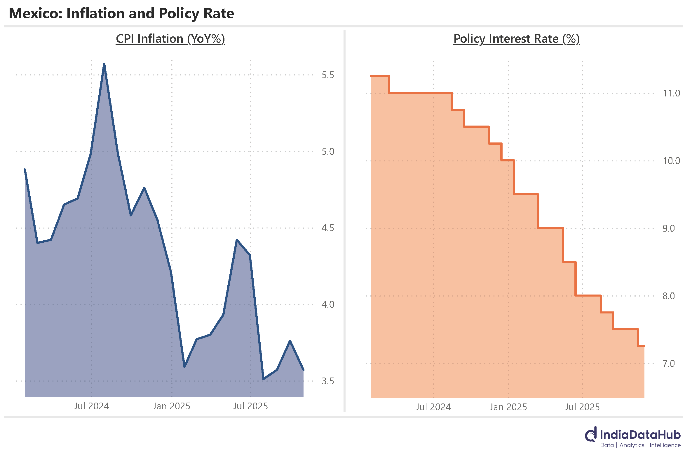 In contrast, the Bank of Mexico reduced its policy rate by 25 basis points, lowering it from 7.5% to 7.25%. Over the past year, the policy rate in Mexico has fallen by 300bps. In part, this is being driven by a sharp fall in inflation. In October 2025, Mexico saw CPI inflation print at 3.6%, down 20bps on a MoM basis but more importantly, down 120bps over the past year.