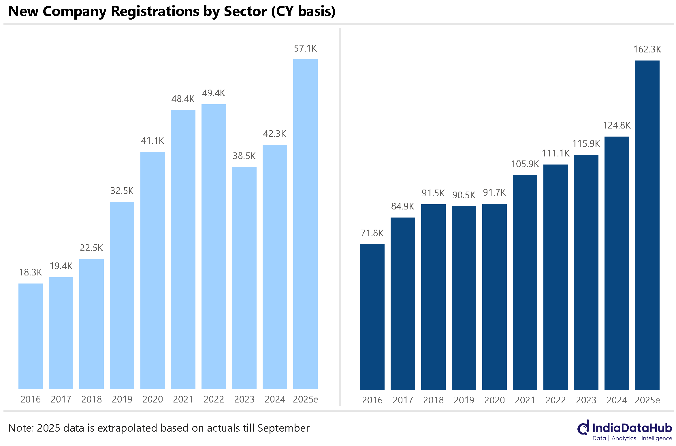 Most of this growth is being driven by Industrial sector companies, which have seen a 36% growth so far (till Sept), while the services sector has also seen a 30% increase. That said, the sharp growth in new Industrial sector companies is not a structural trend. While 2025 might see just over 55k companies being registered at this rate, the year 2022 also saw almost 50k industrial sector companies. The real story is in the services sector, which continues to see secular growth in new firms being set up, despite the large base.