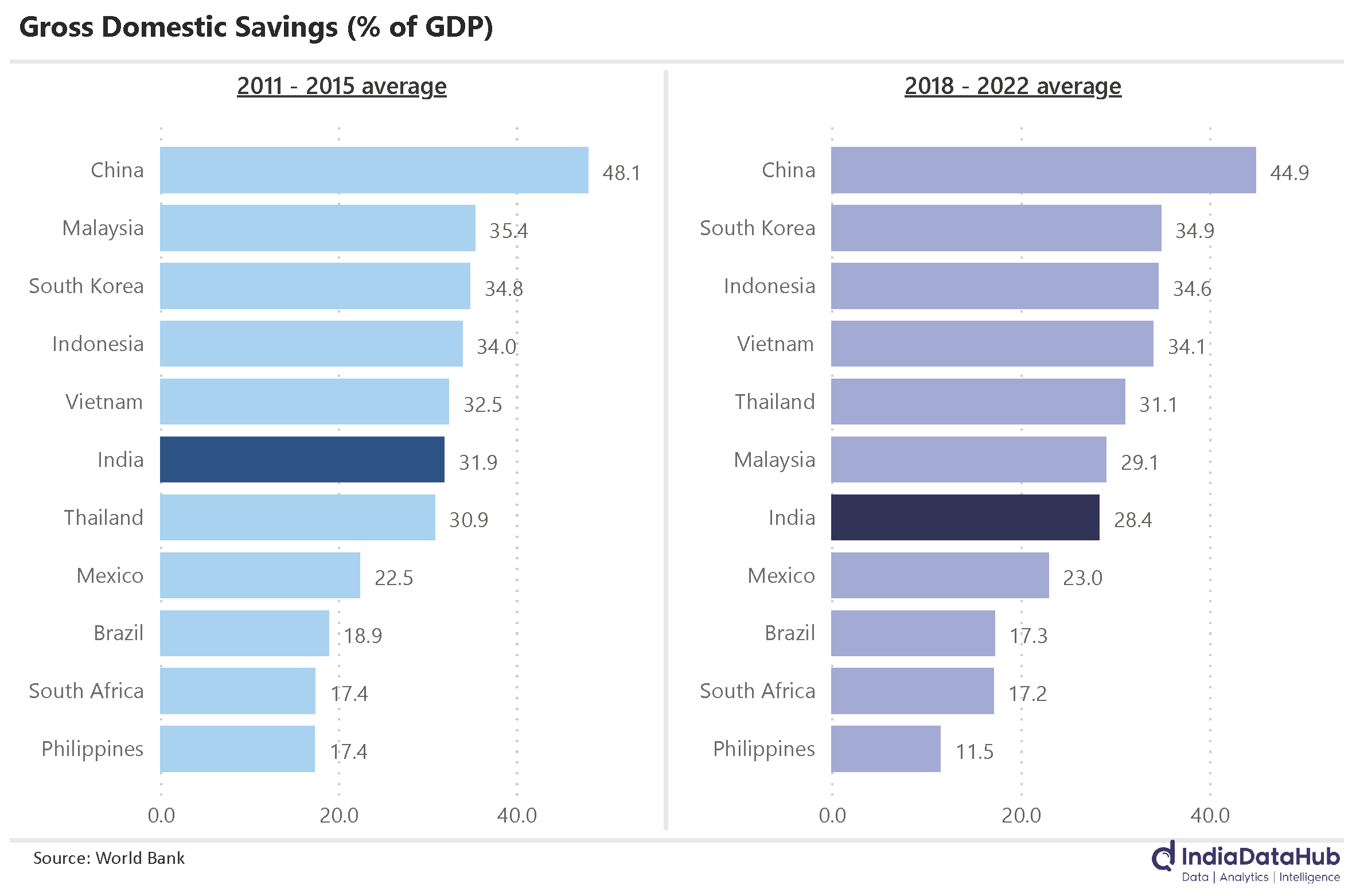 The big picture though is that India's savings rate has been on a downtrend in recent years. At 29% of GDP in FY23 India’s savings rate will be the lowest in almost 2 decades. Relative to most other Asian emerging market economies, India’s savings rate is now almost 4-5ppt lower. So, from an EM context, India has gone from a relatively high savings economy to a moderate savings economy. Among the Asian countries, only the Philippines has a lower savings rate than India. Our savings rate is still much higher than say the Latin American countries like Brazil or Mexico where the savings rate is below 25%.