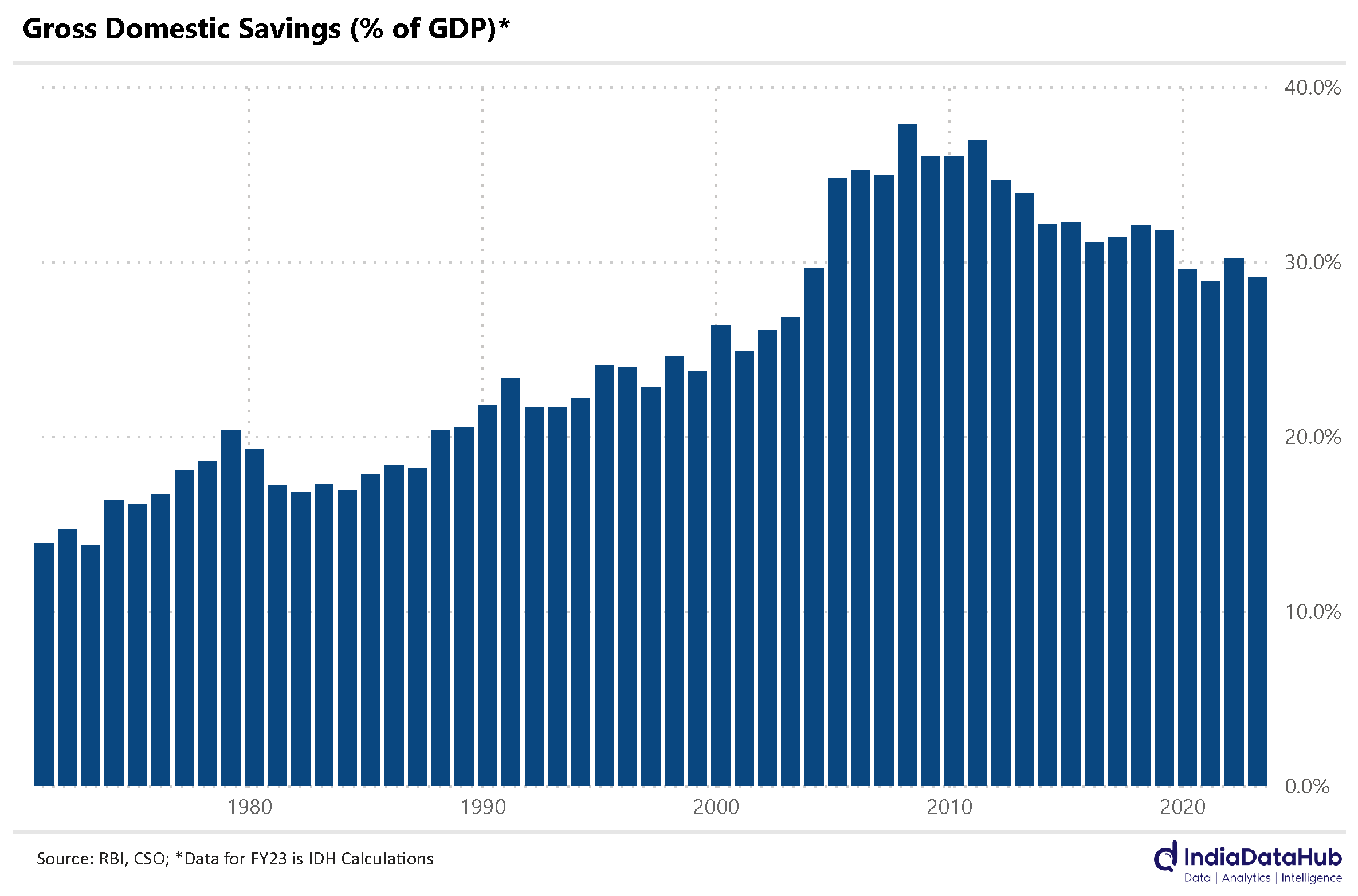 What we know however is that the overall economy-wide savings rate declined in FY23 to ~29% of GDP from 30% of GDP in FY22. This is because India’s CAD expanded in FY23 even though the investment rate declined modestly (and the gap between investments and savings equals the CAD).