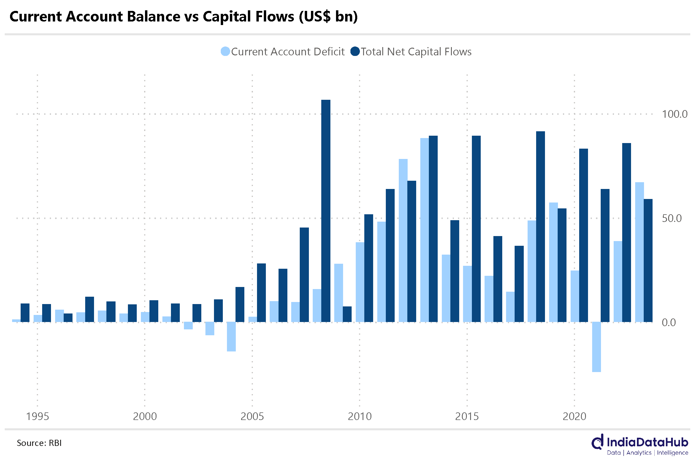 From a policy perspective though the reason the government has been chasing this is because this opens one more source of capital flows. And because we as a country run a structural current account deficit (CAD), we need fairly large capital flows every year. However, in most years India has been comfortably able to meet the CAD through the existing sources of capital flows such as FDI, commercial borrowings and portfolio flows into equities. In the last 3 decades, for example, there have only been 5 years in which the capital flows were not sufficient to meet the CAD.