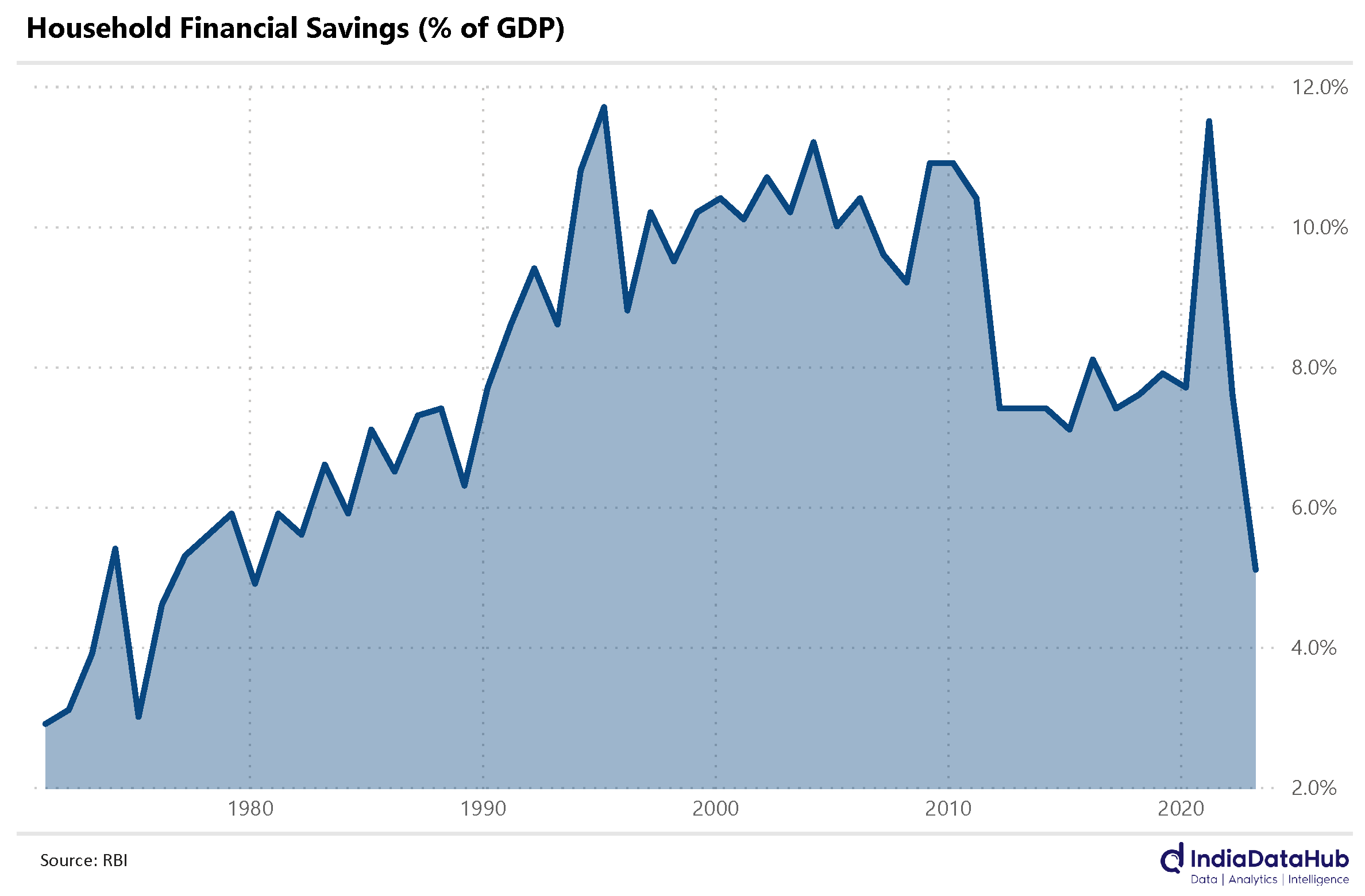The second big story for the week was the financial savings data. As per the provisional data from RBI released this week, the financial savings of households declined to a multi-decade low (43-year low to be precise) of 5.1% of GDP in FY23. Now financial savings is only one part of the picture, the other being physical savings for which we will get data only early next year. So, we do not know for sure whether the lower financial savings have been offset by higher physical savings or whether they reflect lower household savings in aggregate.