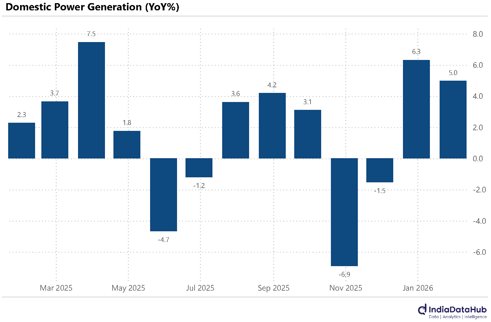Power generation grew 5% YoY in January as per provisional data. This is broadly the same growth as in December and was at the upper end of the range of the past few quarters. Renewables continue to drive this growth, with power generation from renewable sources growing over 20% in January. In contrast, power generation from conventional sources grew by a modest 2%.
