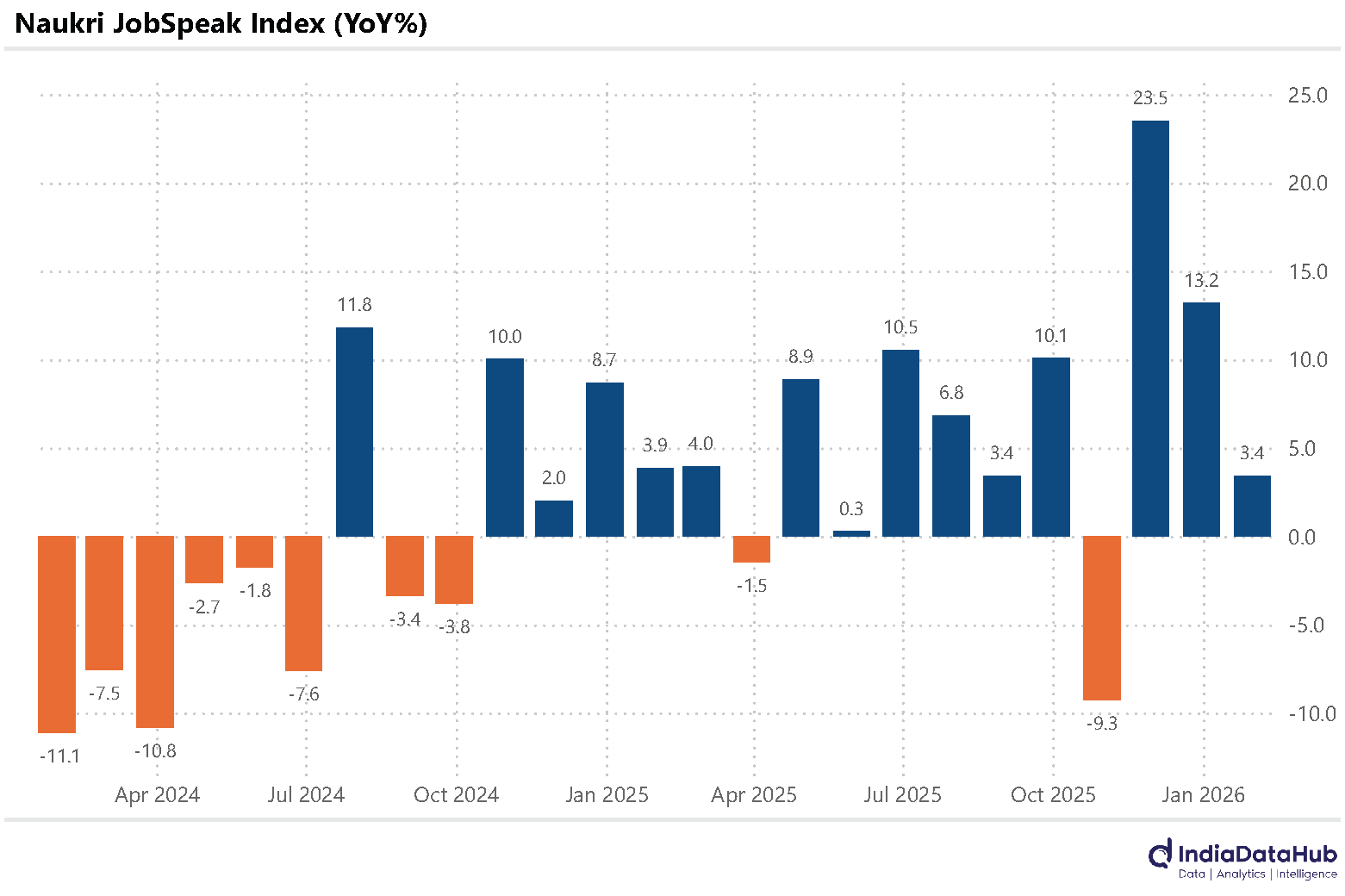 Lastly, White-collar hiring moderated in January, with the Naukri JobSpeak Index growing by a modest 3% YoY after a double-digit growth in the previous month.