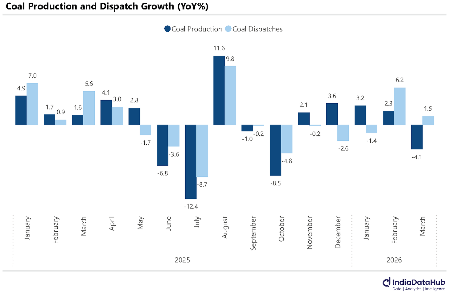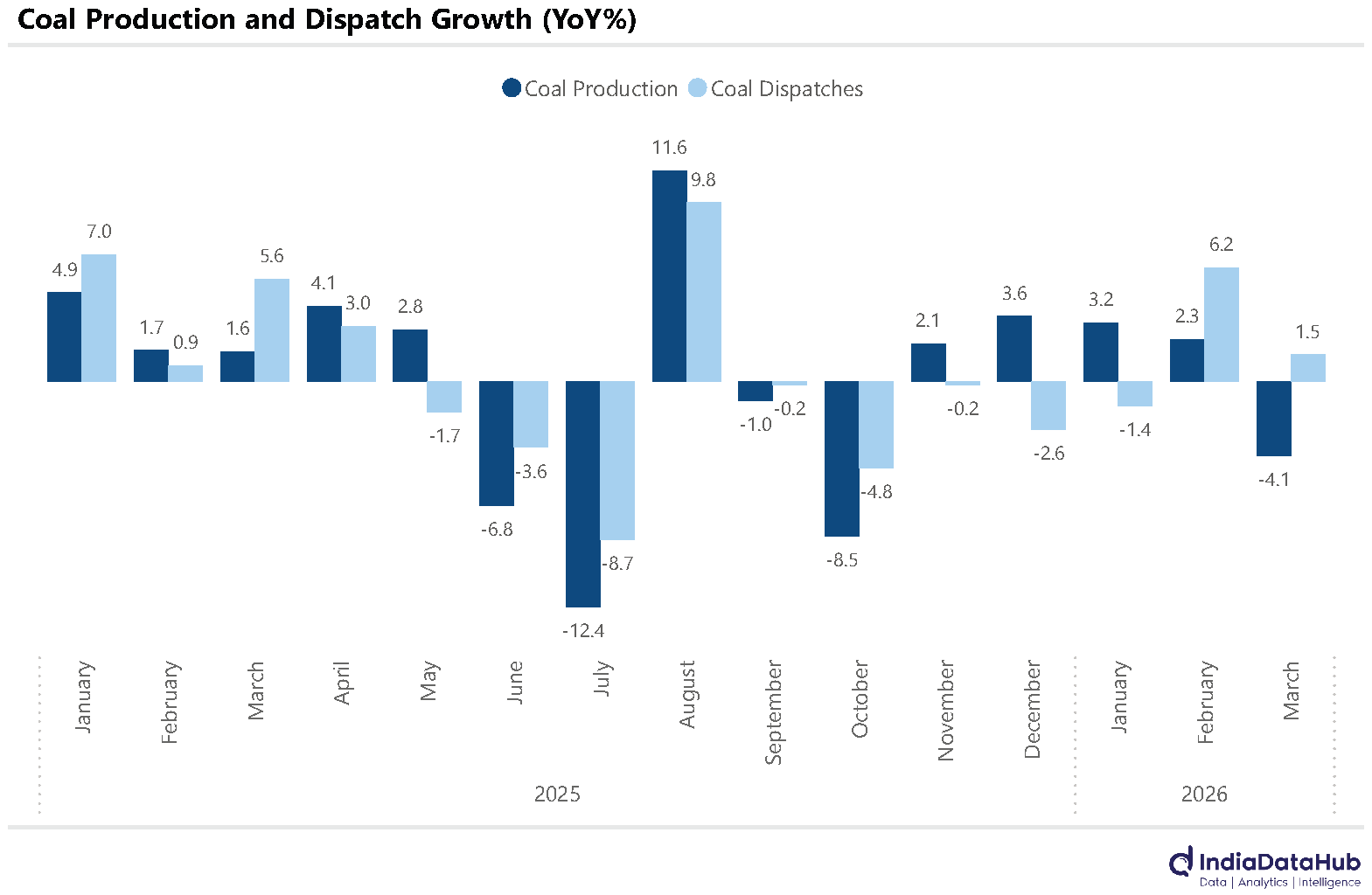 Domestic coal production growth declined by 4.1% YoY in March, the first decline in the last 4 months. On the demand side while coal dispatch growth was positive, it was subdued at less than 2% YoY. Sectoral trends suggest weakness in industrial sector demand: dispatches to the sponge iron sector declined 34% YoY, marking the 11th consecutive month of contraction.