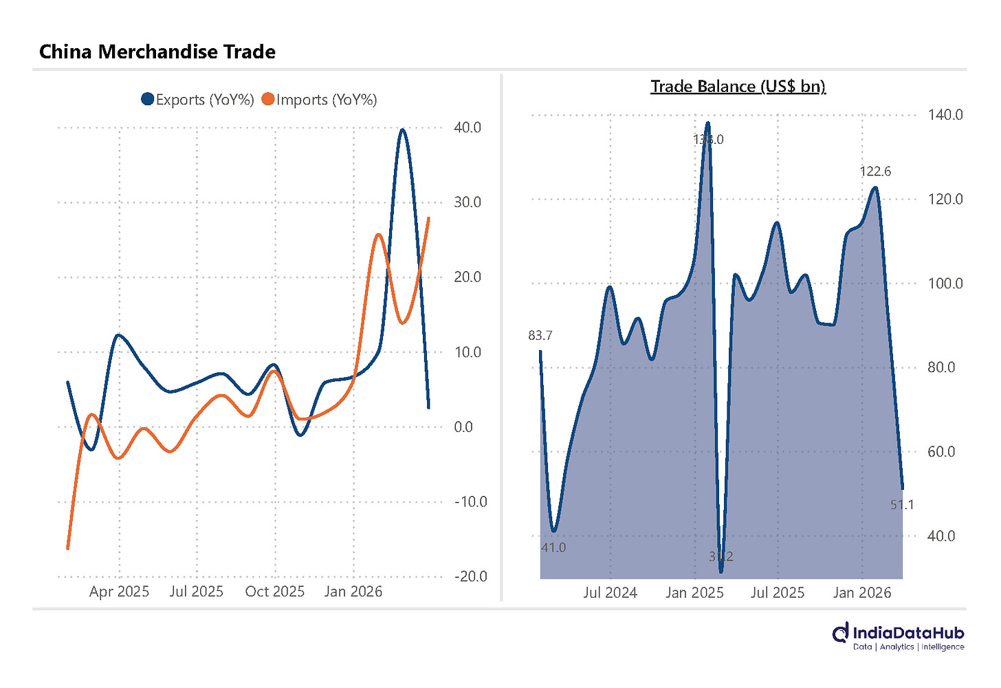 Trade with the U.S. remained weak: exports to the U.S. fell 26.5% YoY, while imports from the U.S. rose 2.1% YoY, ending a year‑long decline. As a result, China’s bilateral goods trade surplus with the US narrowed to $16.8 billion — its lowest level since March 2025.