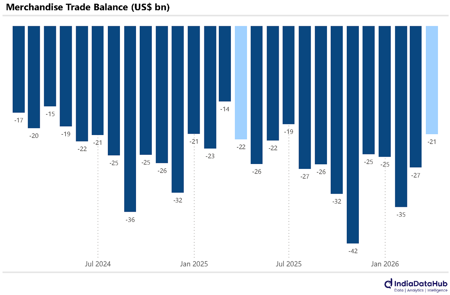 The sharp decline in both exports and imports meant that the trade deficit declined modestly on a YoY basis and at just under US$21bn, it was the lowest since June in absolute terms.