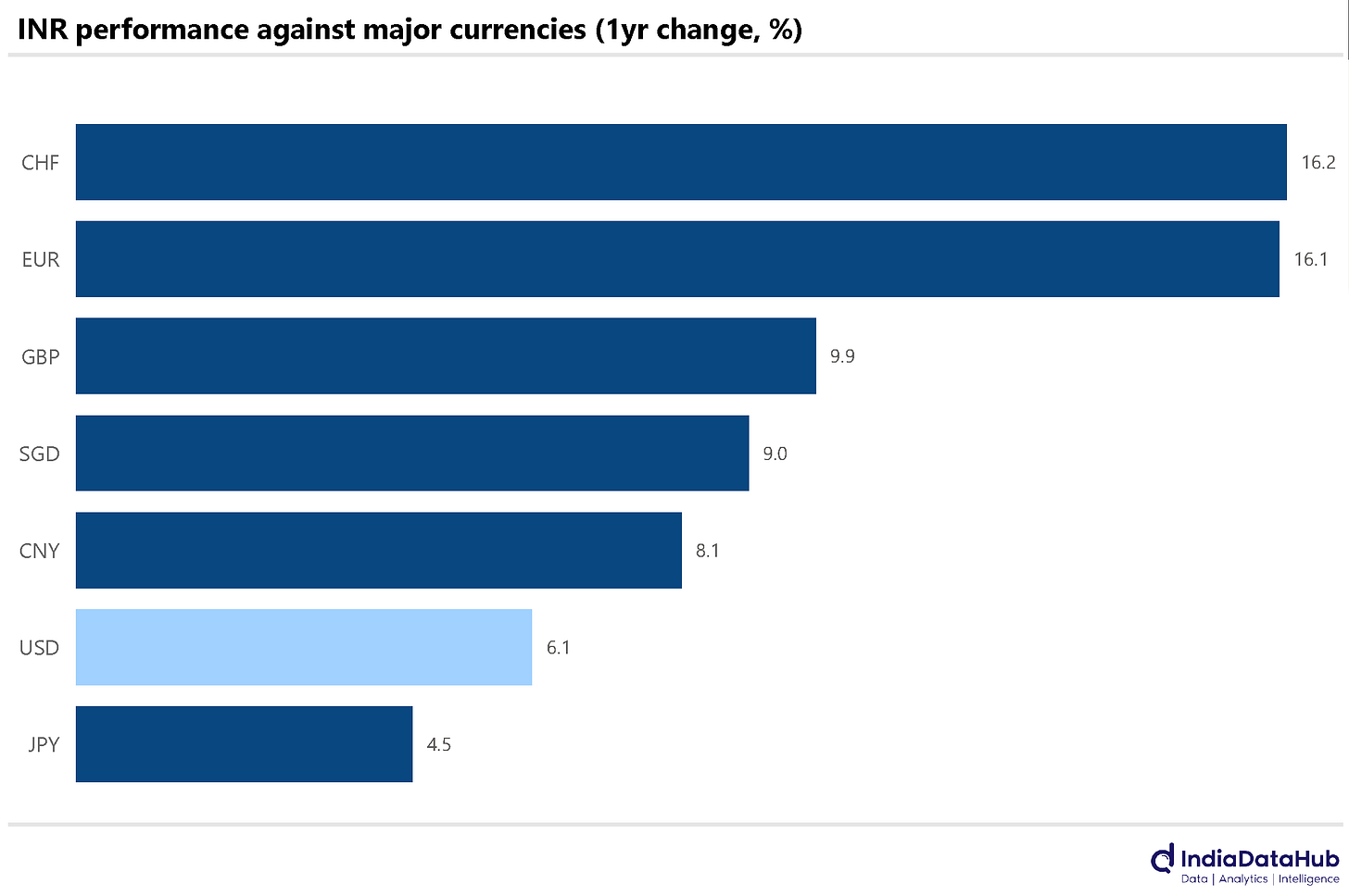 And this is also flowing through the rupee, which closed very close to the 90 mark against the US Dollar on Friday. Over the past few months, the INR has seen gradual depreciation against the USD and most other major currencies. The IDH INR Index has fallen ~8% over the past year as the INR has depreciated by 6% against the USD, 8% against the CNY, 10% against the GBP and 16% against the EUR during this period.