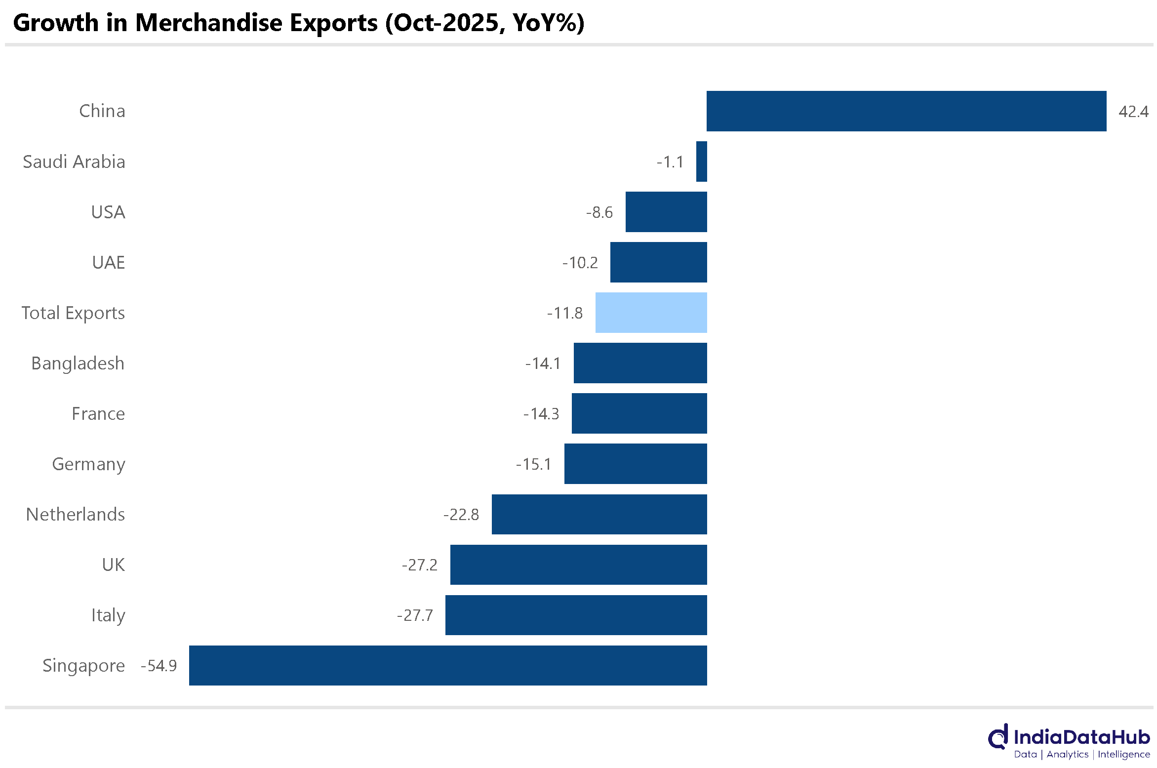 India’s exports declined a sharp 12% YoY in October after a few months of high single-digit growth. And surprisingly, this was not due to a decline in exports to the USA. Exports to the USA declined, but by only 9% YoY. Exports to Singapore declined by over 50%, accounting for more than a quarter of the overall decline in exports. Exports to several European countries also saw a sharp decline. Exports to the UK, Italy and the Netherlands, for example, declined over 20% YoY and those to Germany and France declined by ~15%. On the flipside, exports to China saw a sharp 40% increase. And even YTD (Apr-Oct), while overall exports are largely unchanged on a YoY basis, exports to China have grown by almost 25% YoY. China has overtaken the UK and Singapore to become the 4th largest export destination for Indian goods, very close behind the Netherlands.