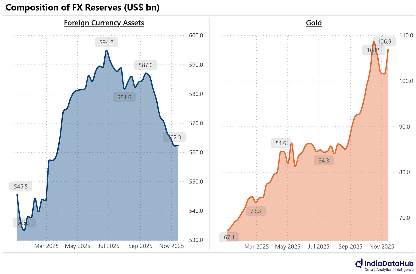 And the RBI continues to dip into FX reserves to support the Rupee. And as we have discussed a couple of times before, this intervention is not manifesting itself in total FX reserves, as the appreciation in the value of Gold is offsetting the decline in foreign currency assets. As of 14th November, the total foreign currency assets stood at US$562bn, down US$32bn since their level in late June. This decline has been almost fully offset by a US$22bn increase in the value of Gold holdings.