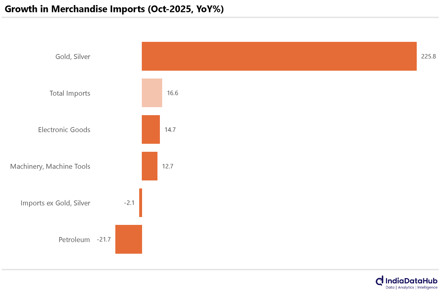 Imports meanwhile grew 17% YoY in October, the sharpest growth in recent months. This was driven largely by a near tripling of gold imports and more than quintupling of silver imports. Excluding these precious metals, imports declined 2% YoY. So the rise in imports is not broad-based. To some extent, there is also a seasonal angle to both the decline in exports and the increase in precious metal imports as Diwali was earlier this year compared to last year.